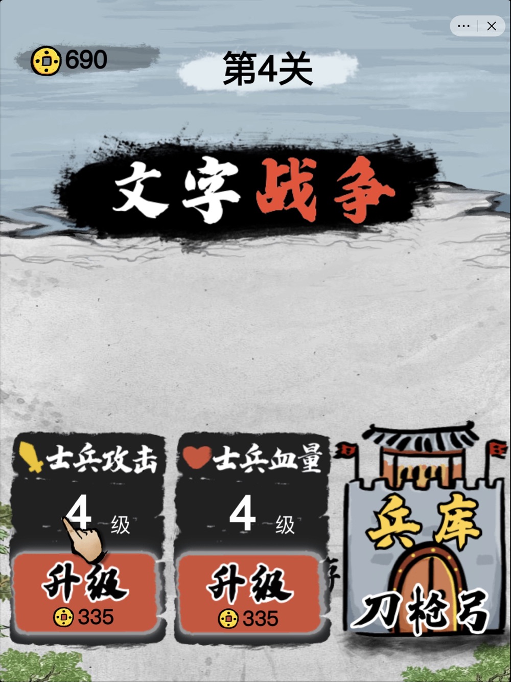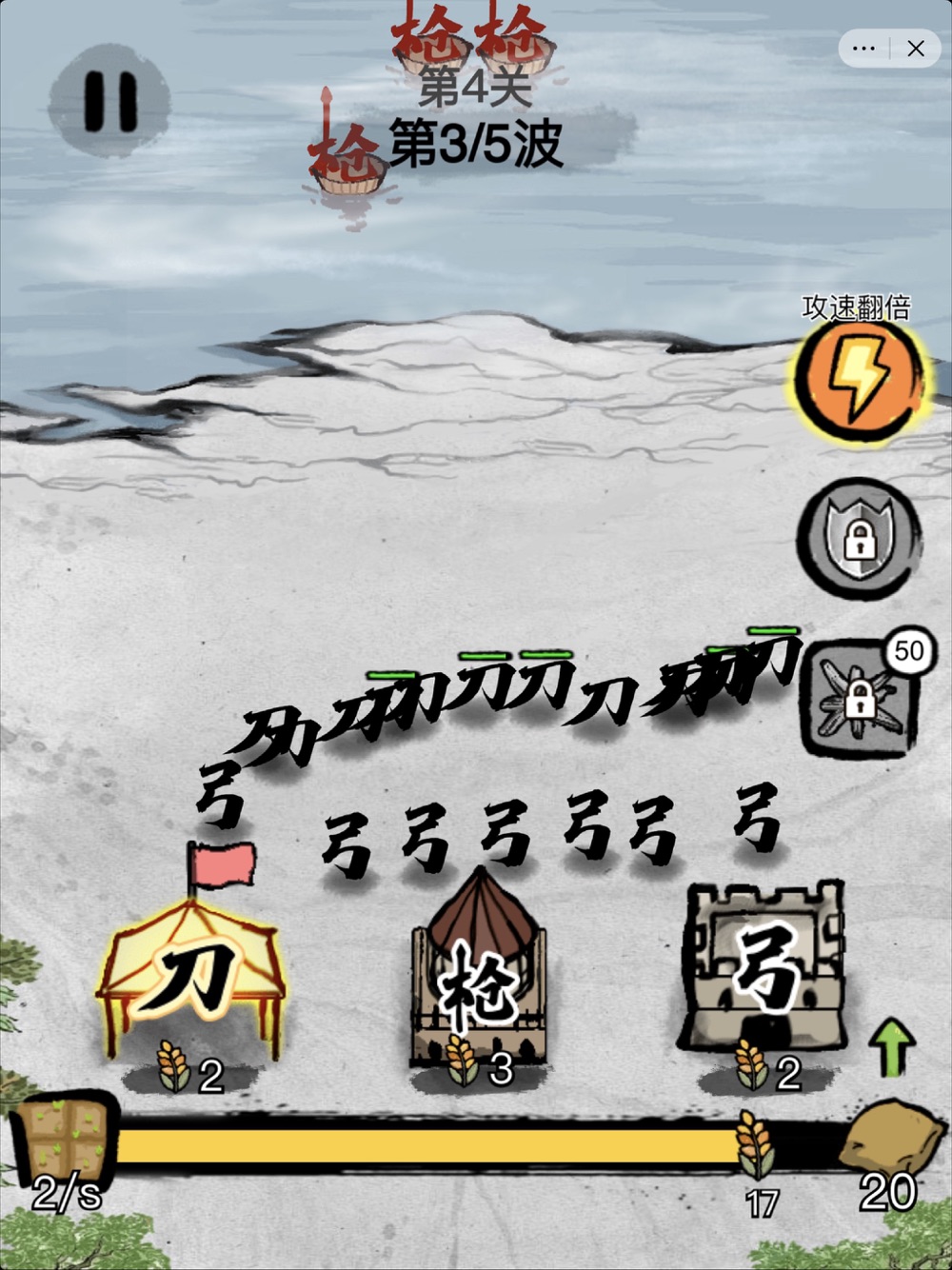 《文字战争》是一款水墨中国风的策略防守小游戏。每一个文字代表一个相应的士兵。玩家可以升级兵营、粮草供给,从而提高战斗力。当敌方来袭,玩家需要根据战场形势来部署防御部队。