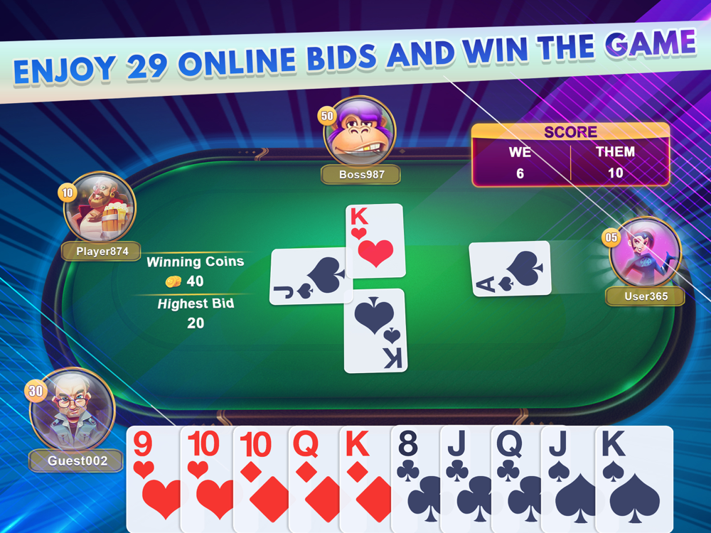 Bored sitting at home or the subway? Just launch the Online 28 & 29 multiplayer card game and rack your brains and win!
