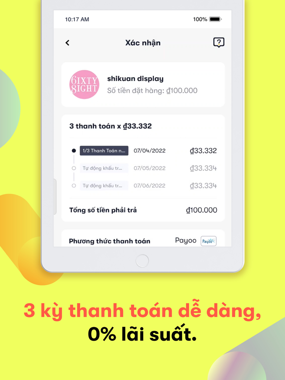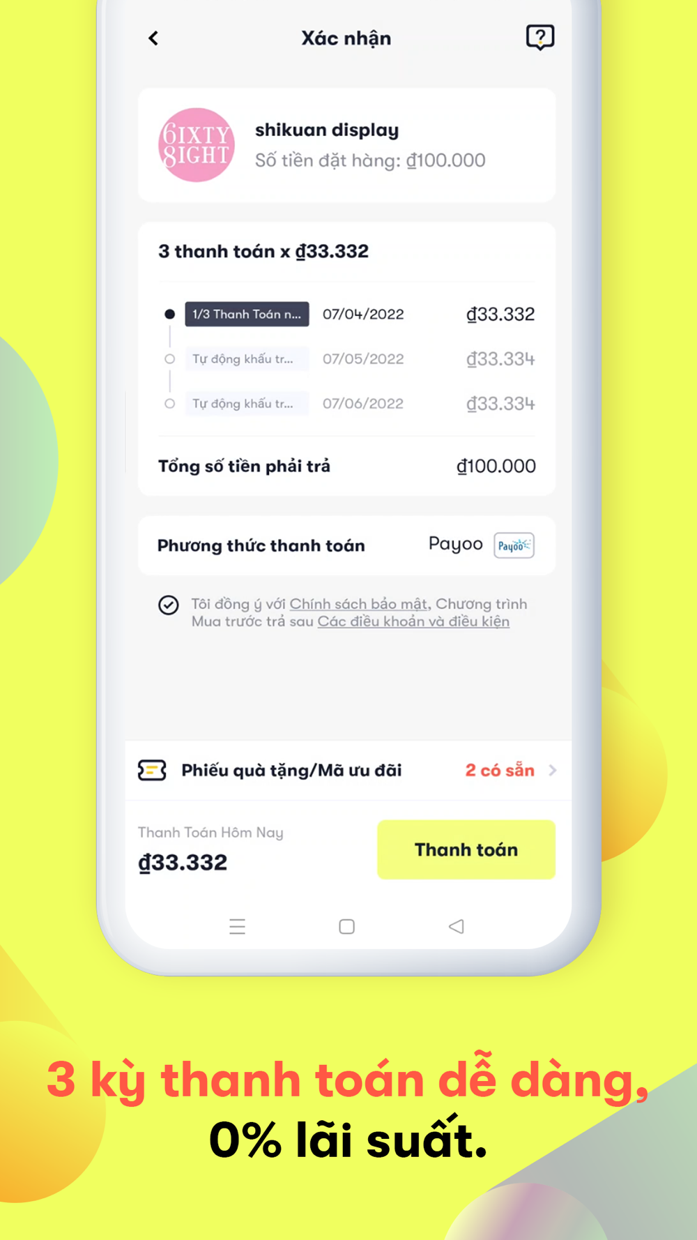 2. Thực hiện thanh toán. Atome tự động chia đơn hàng của bạn thành 3 lần thanh toán bằng nhau. Bạn chỉ cần thanh toán 1/3 giá trị đơn hàng tại lần mua đầu tiên. Hai khoản thanh toán tiếp theo sẽ được áp dụng trong 30 ngày kế tiếp với không lãi suất hoặc phí ẩn.