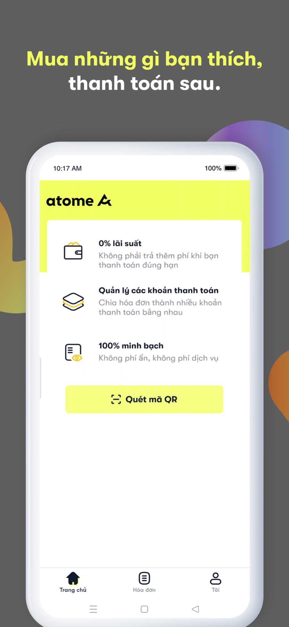 Tải ứng dụng Atome ngay bây giờ để nhận phiếu mua hàng giảm giá đến 50.000 VND cho lần mua hàng đầu tiên khi bạn thanh toán trực tiếp tại các cửa hàng hoặc qua gian hàng trực tuyến mà bạn yêu thích !