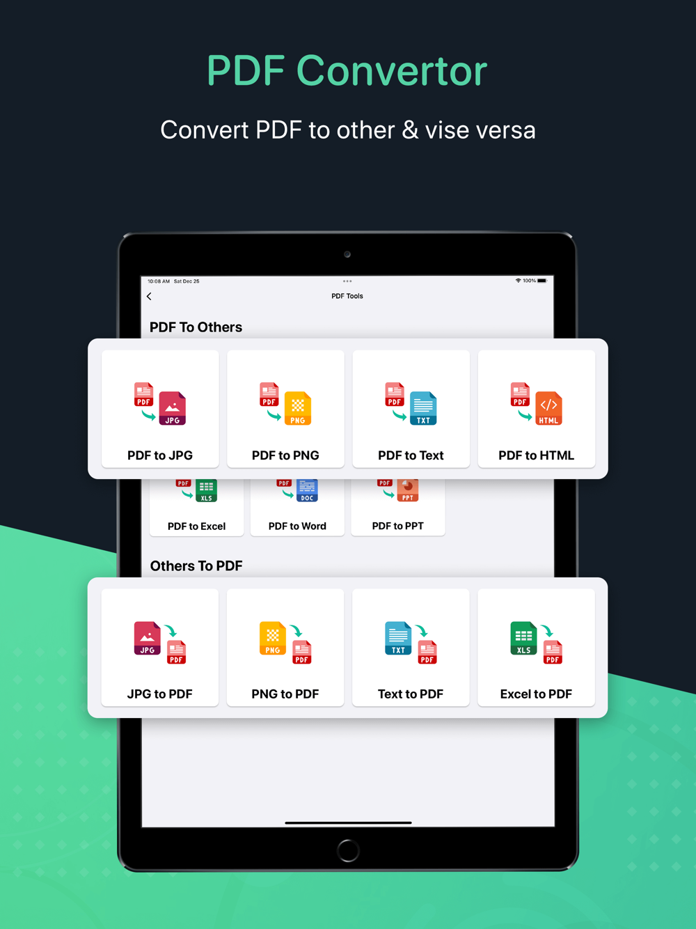 Convert PDF files to JPG, PNG, Text, HTML, Excel, Word, and PPT, as well as reverse the process.