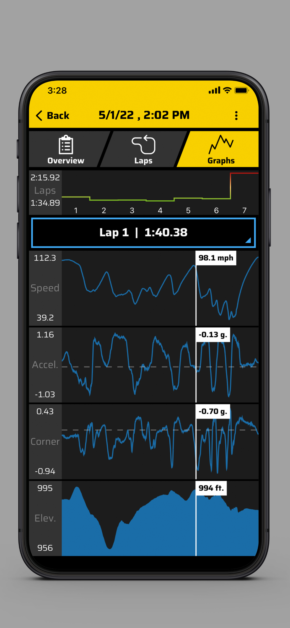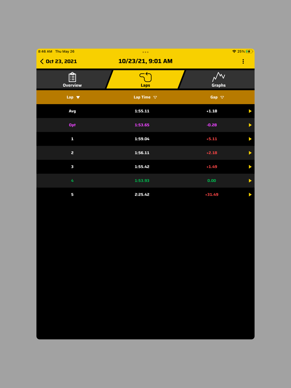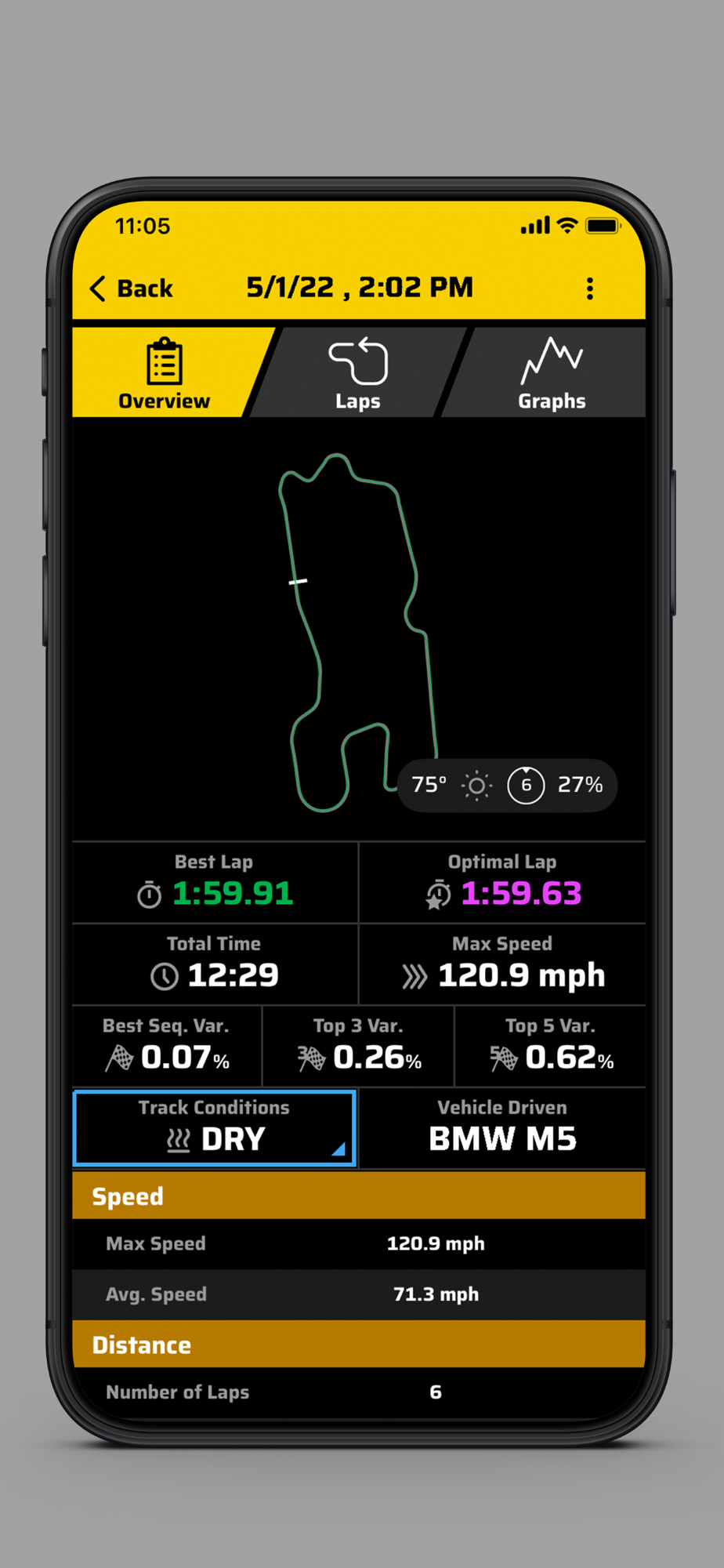 • Shows your session summaries, lap times, session weather conditions, lap-by-lap data and annual driving activity metrics