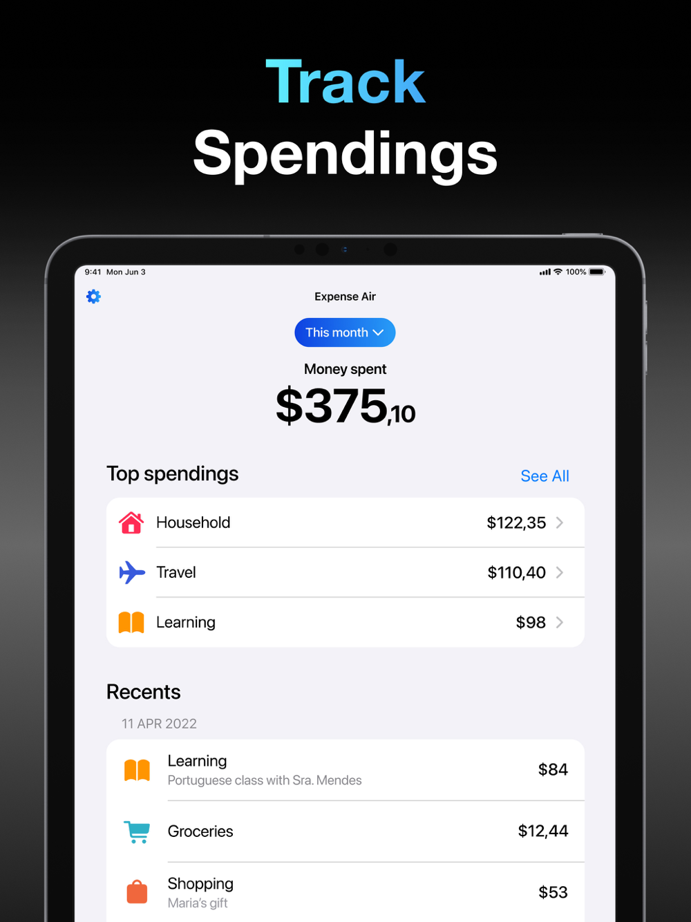 Expense Air is your personal expenses tracker which helps you to manage your finances, stick to your goals, and stay organized. Stay in control and monitor your spending with the help of our budget tracker feature.