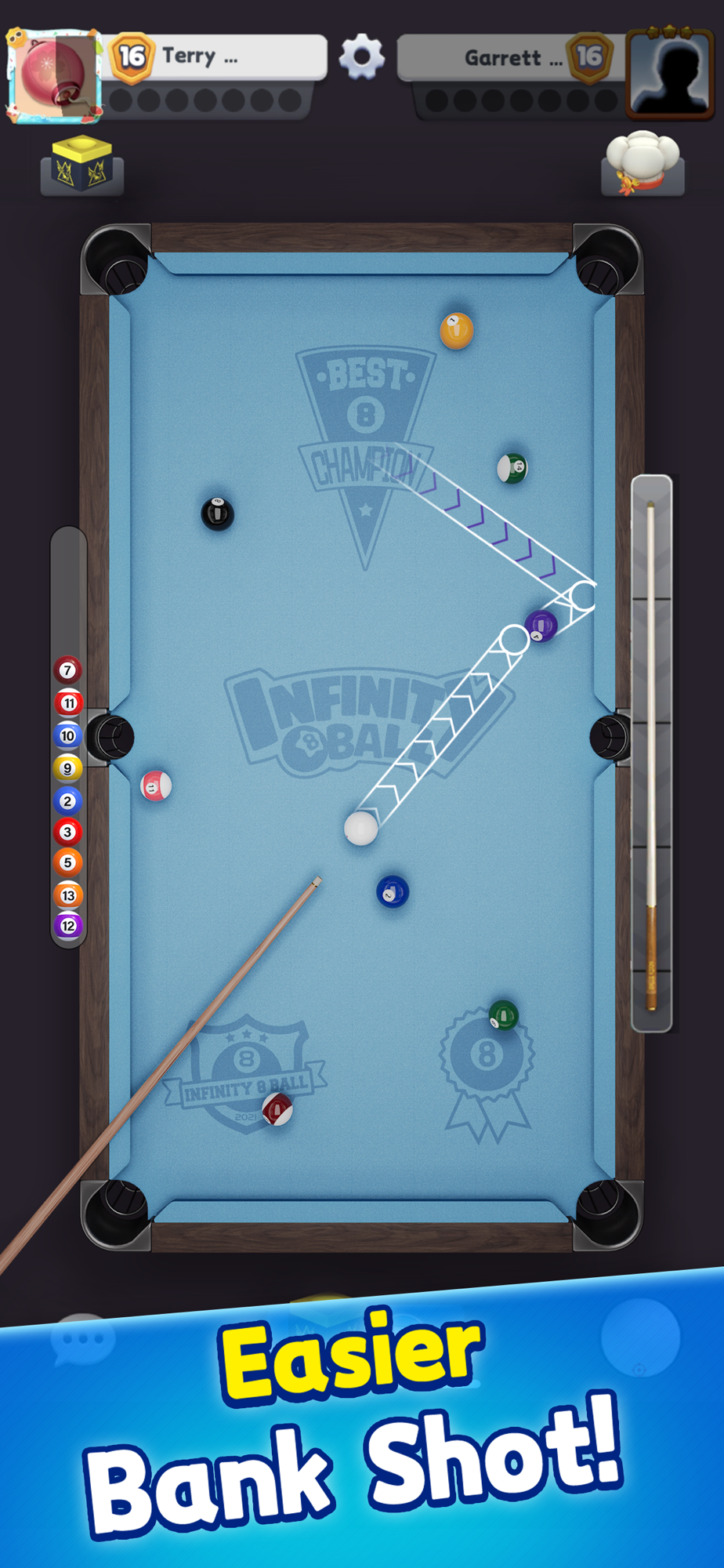 No more shooting against a ruler. With Infinity 8 Ball™ Pool King, the target line is longer, the angle is easier to adjust and the power control is more precise. Even a beginner can give amazing shots. All you have to do is have fun.