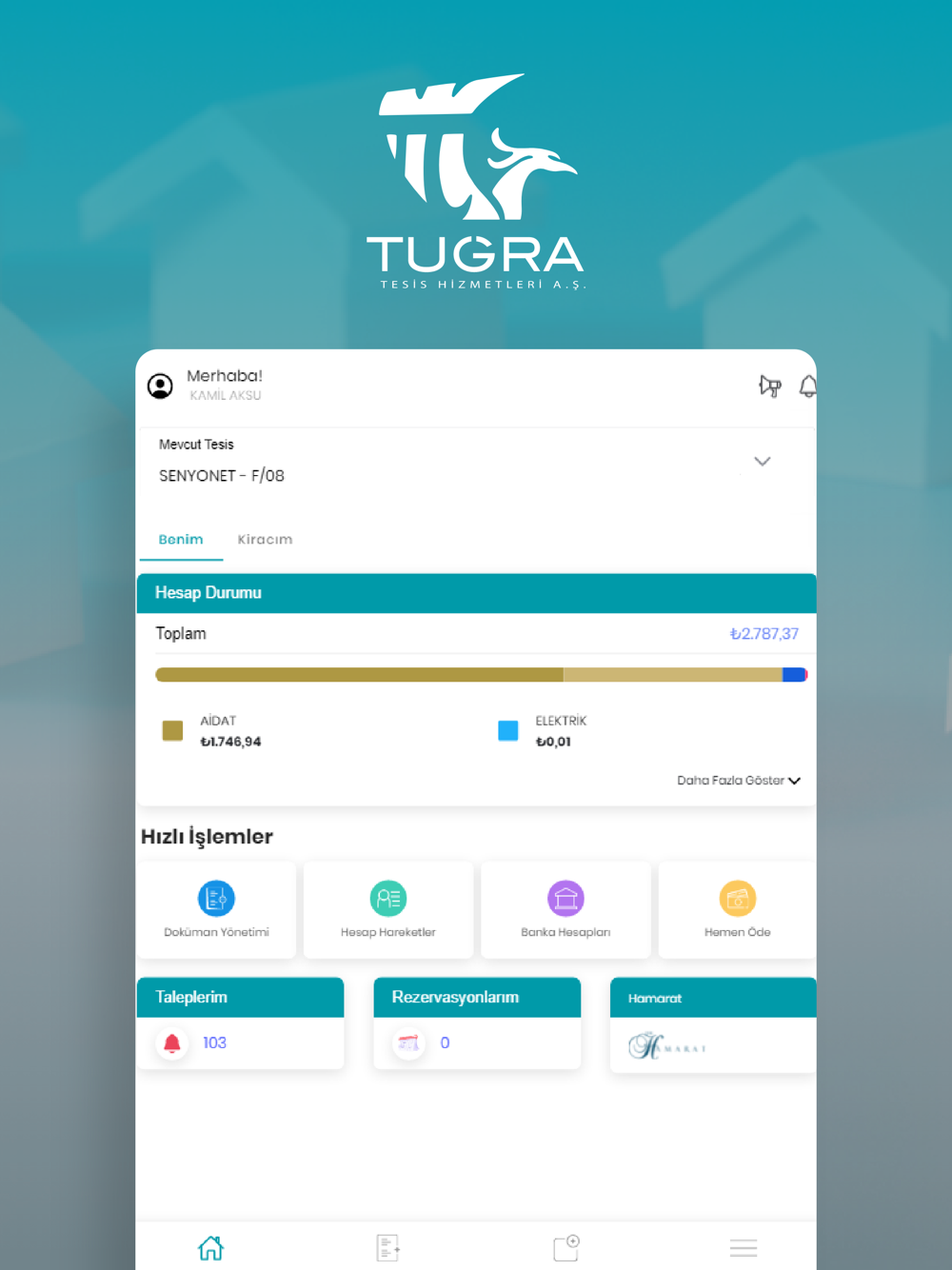 • Taleplerim; Teknik, Güvenlik, Temizlik, Bahçe Bakım vb. hizmetlerinde tespit edilen olumsuz durumların fotoğrafını çekerek iş talebi oluşturma,