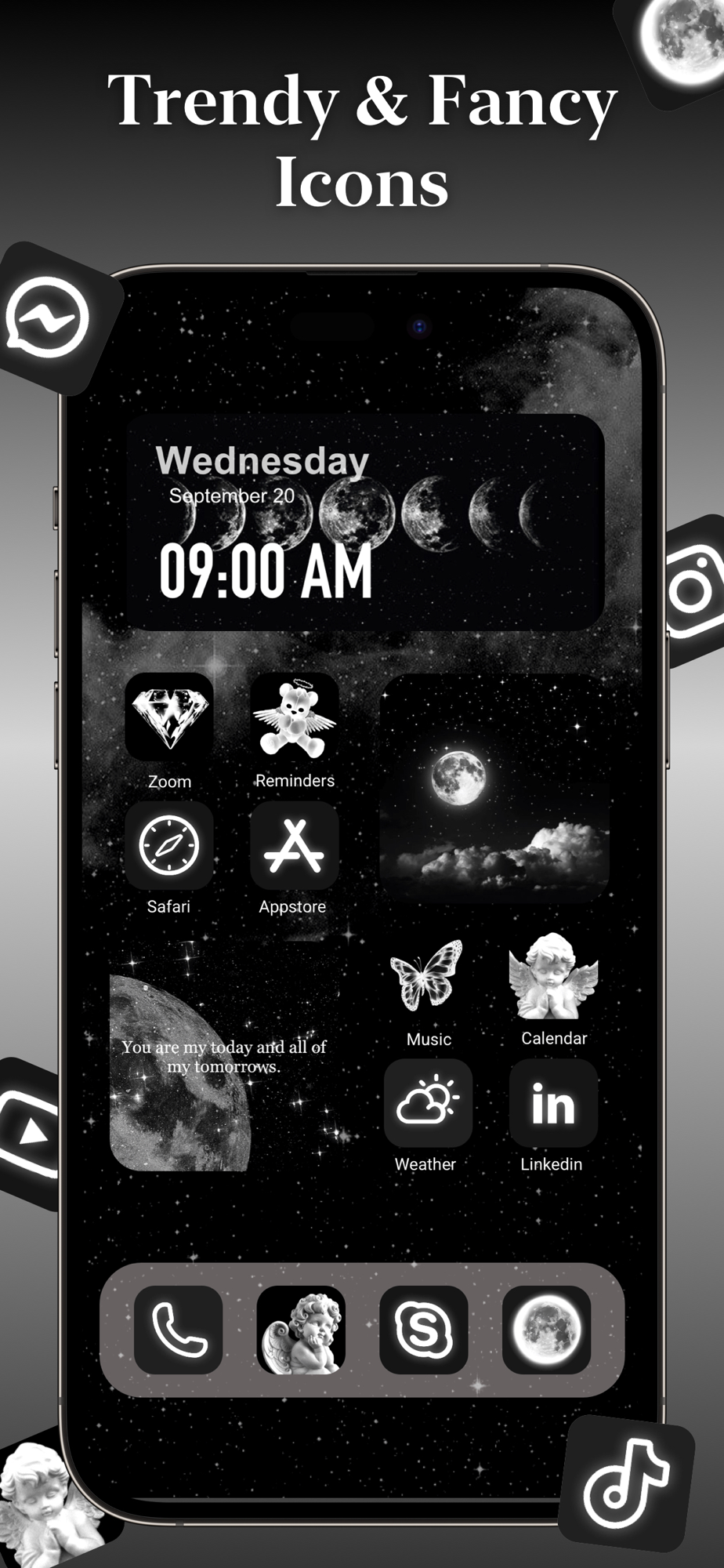 Fancy themes for iPhone: cool widgets, customized app icons, aesthetic wallpapers. Endless personalized options give you a new way to express yourself, and make your iPhone outstanding. A cool screen-saver app is super easy to set up.