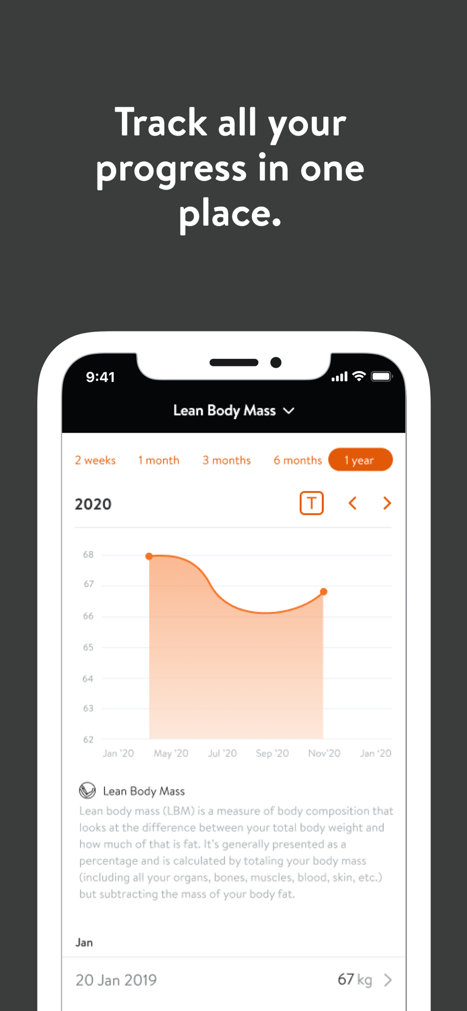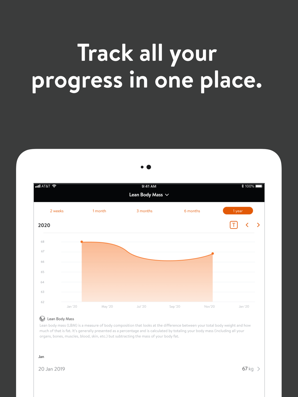 - Track body measurements and take progress photos