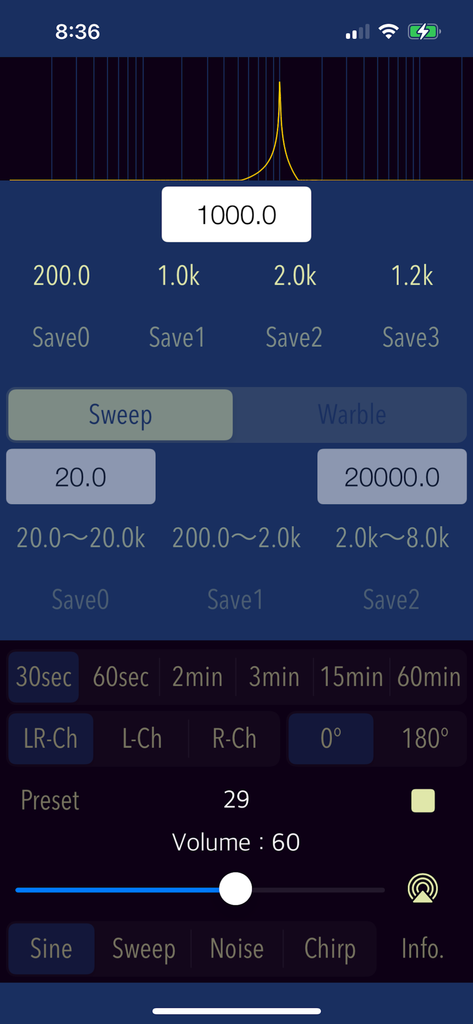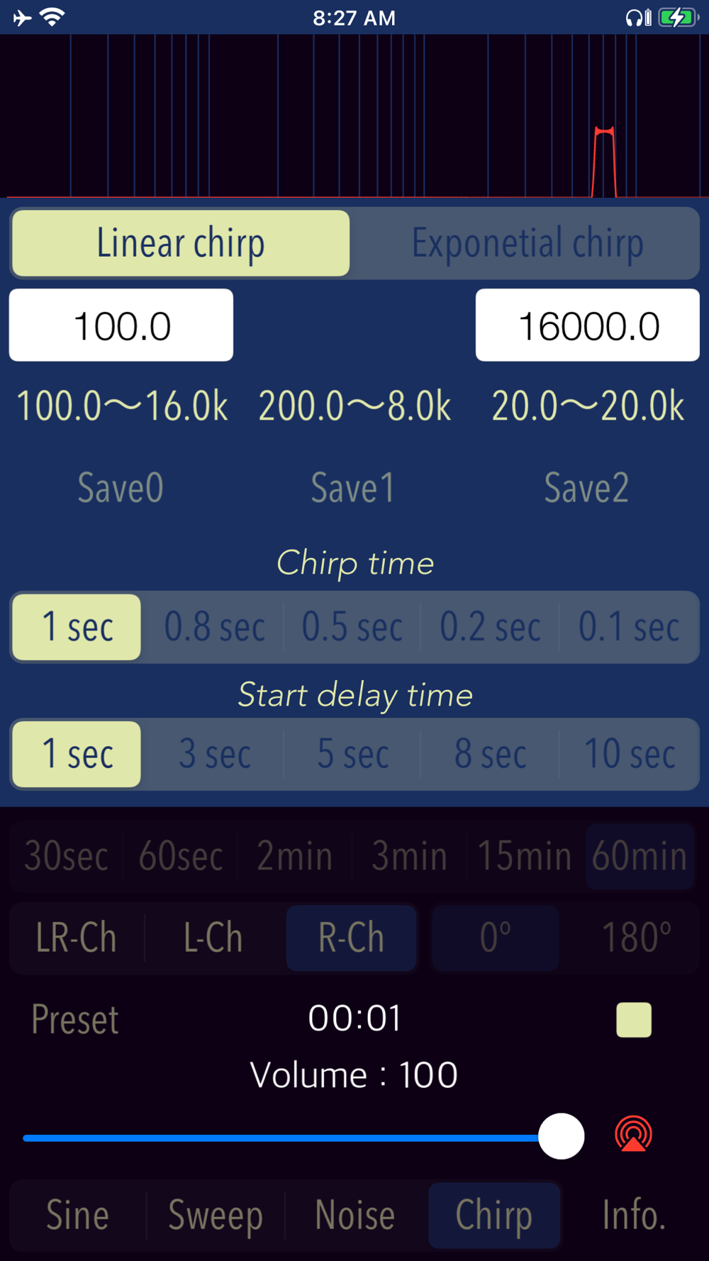 - Frequency Sweep generator (Sweep): Sine wave frequency sweep/warble signal (Preset frequencies: 20Hz - 20kHz, 200Hz - 2kHz, 2kHz - 8kHz, transition time: 30, 60, 120, 180sec), up-sweep/down-sweep playback
