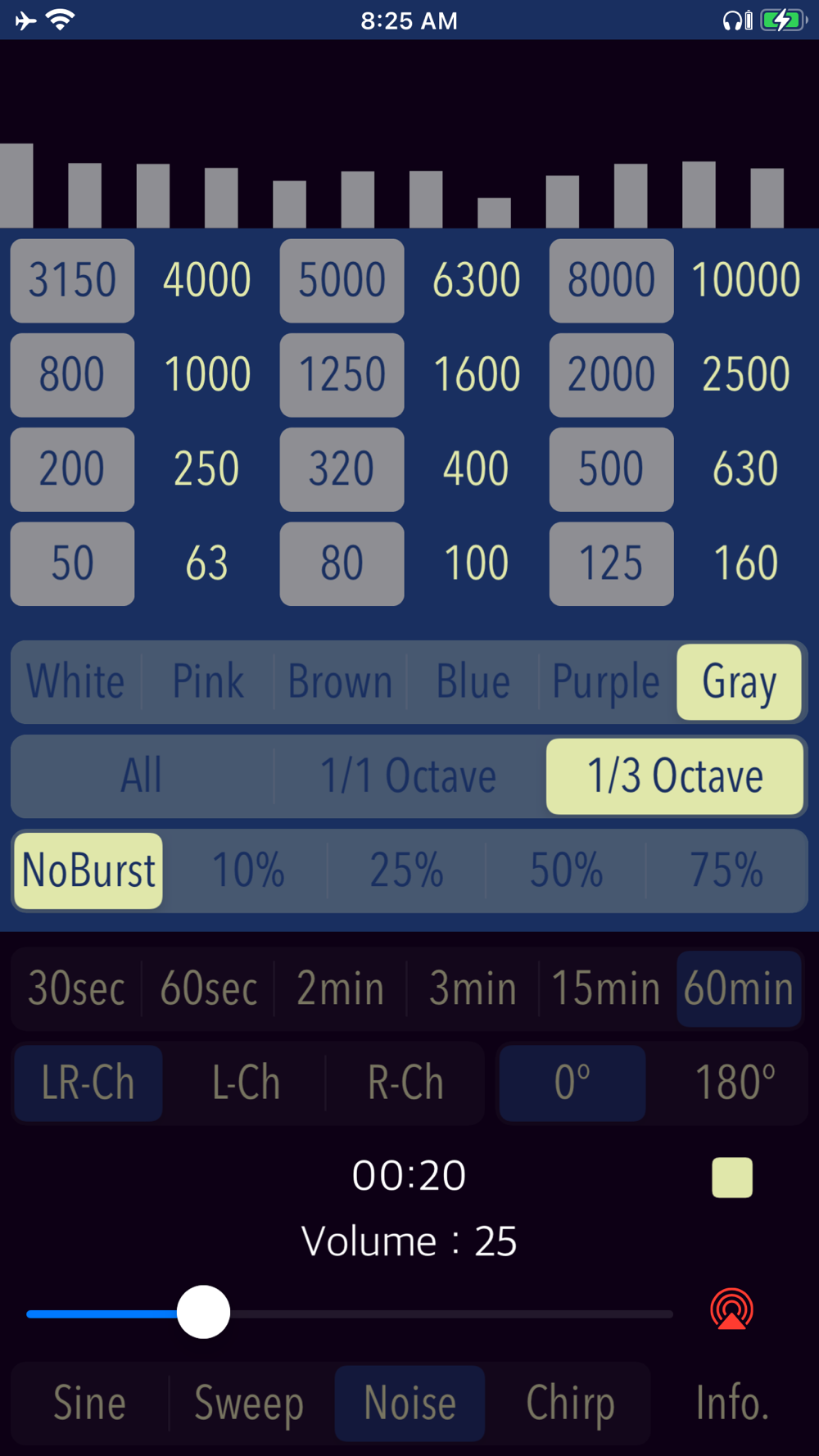 - Colored Noise generator with Octave-band Noise (Noise): White noise, Pink noise, Brown noise, Blue noise, Purple noise and Gray noise. Octave band noise generation by 1/1 or 1/3 octave-band filer (center frequency: 63Hz - 8kHz / 50Hz - 10kHz), burst playback with duty ratio of 10/25/50/75%.