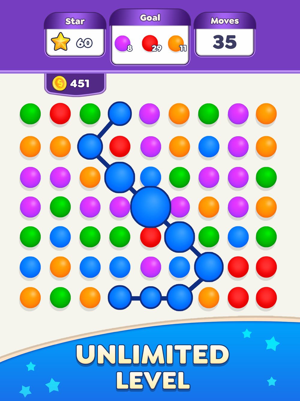 3 Dots - Connect Em All! is challenging matching puzzle game, connecting the balls of same color to crush them.