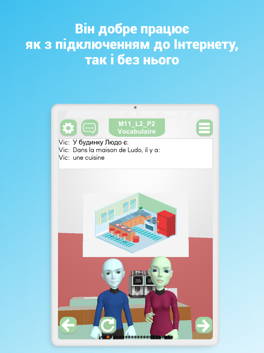 Basic-Français руйнує стіну слів, даючи усні інструкції до вправ вашою рідною мовою. Це дозволить вам вивчити основи французької мови незалежно від рівня вашого шкільного навчання. Basic-Français можна навіть розробити для рідних мов, які не мають алфавіту.