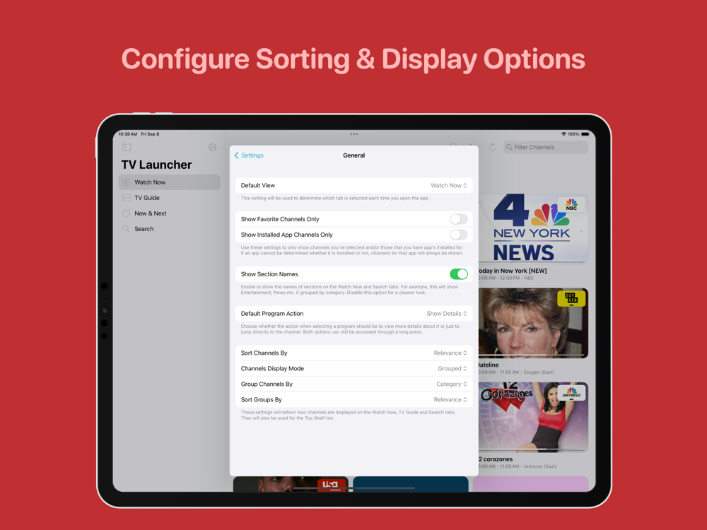 Your favorite channels, hidden channels and other settings all sync via iCloud so if you have multiple devices using TV Launcher, they'll all be kept in sync.