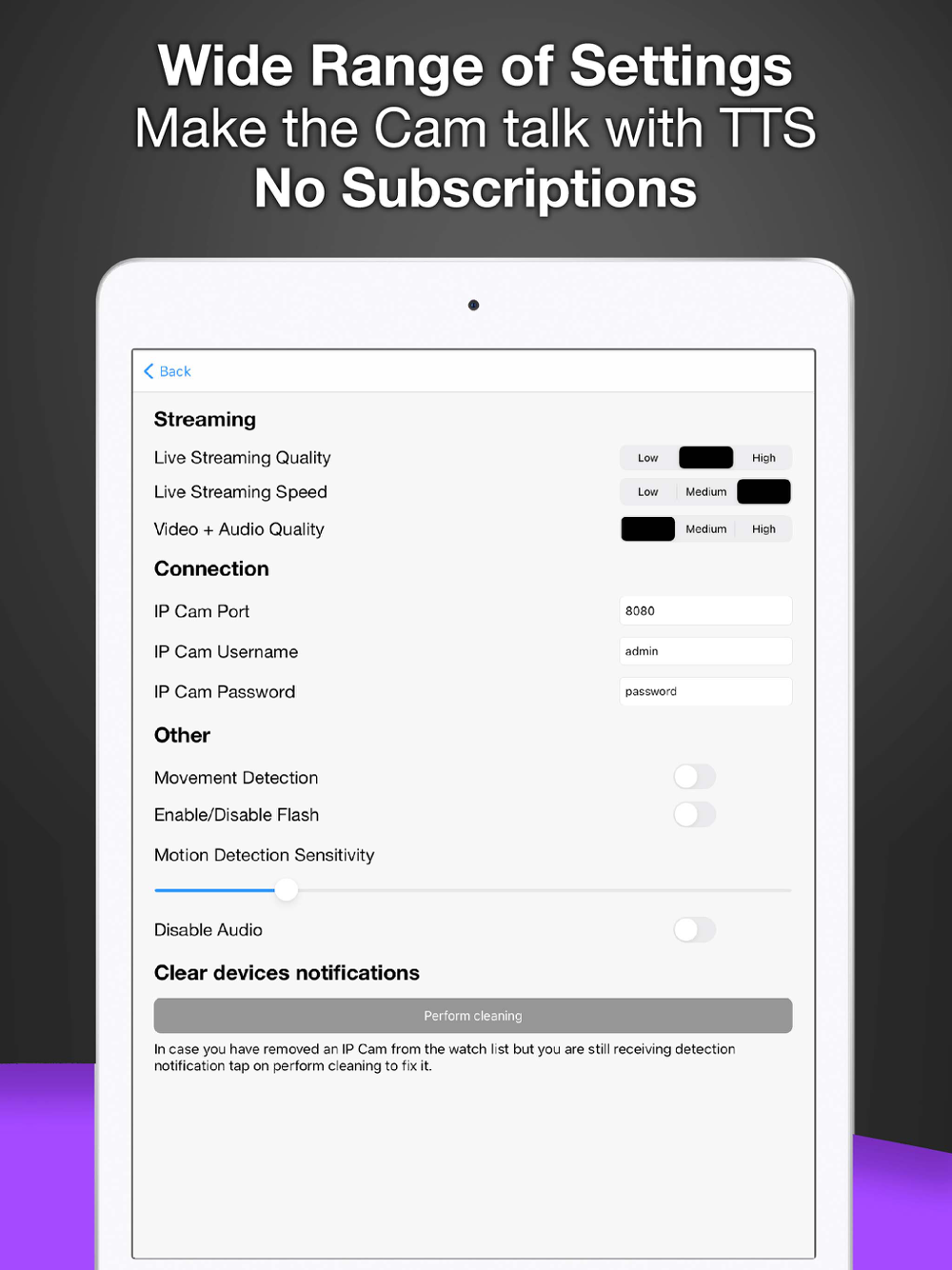 - Motion Detection: after a detection the camera will start recording and will send you a push notification to all the enabled devices;