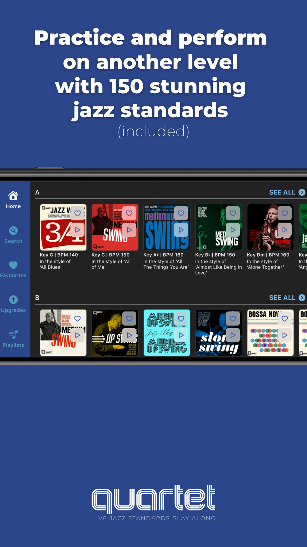 150 stunning jazz standards performed by 7 of the world’s best jazz musicians. All ‘live’ studio recordings with intros and outros. Simply mute your instrument from the quartet for the ultimate jazz play along.
