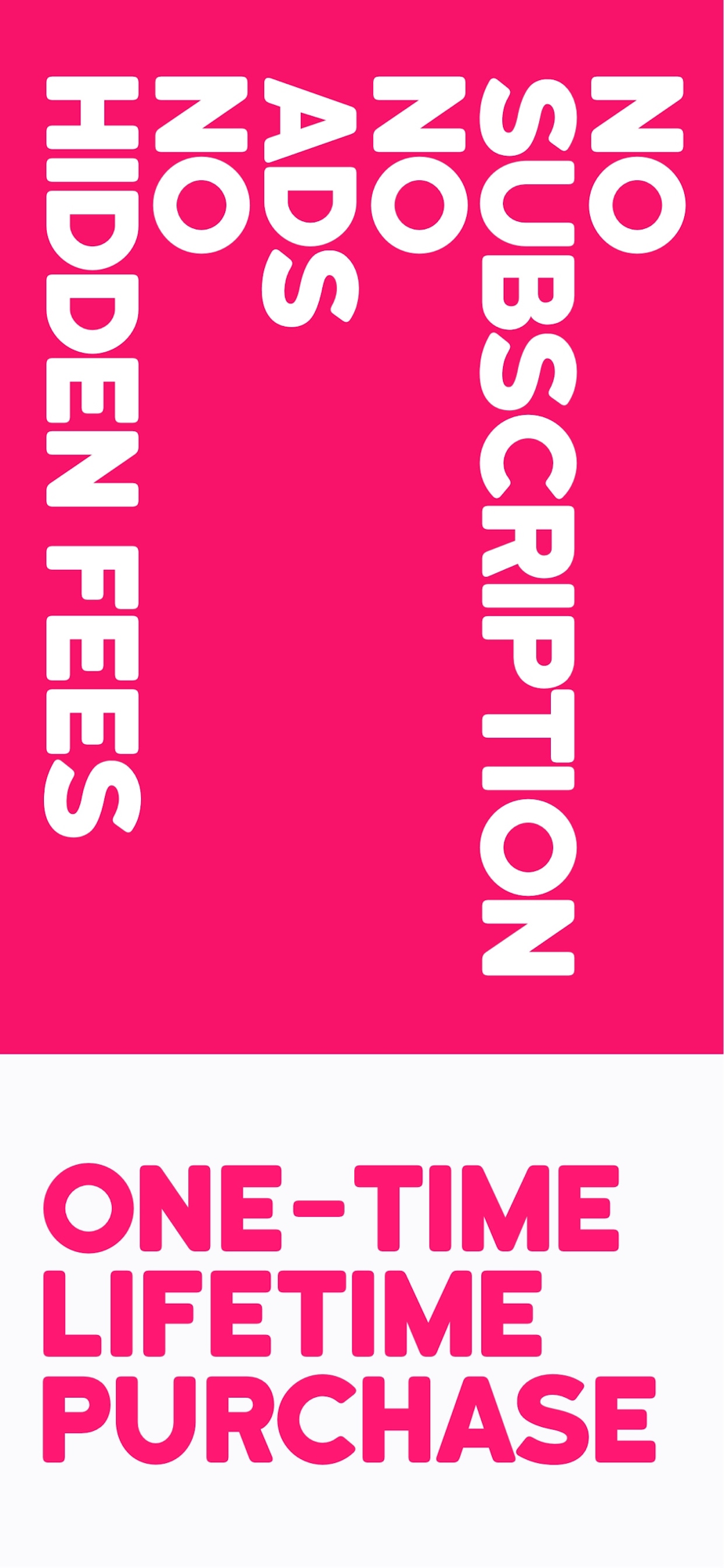 There are no hidden fees, subscriptions, or advertisements. A one-time purchase for life.