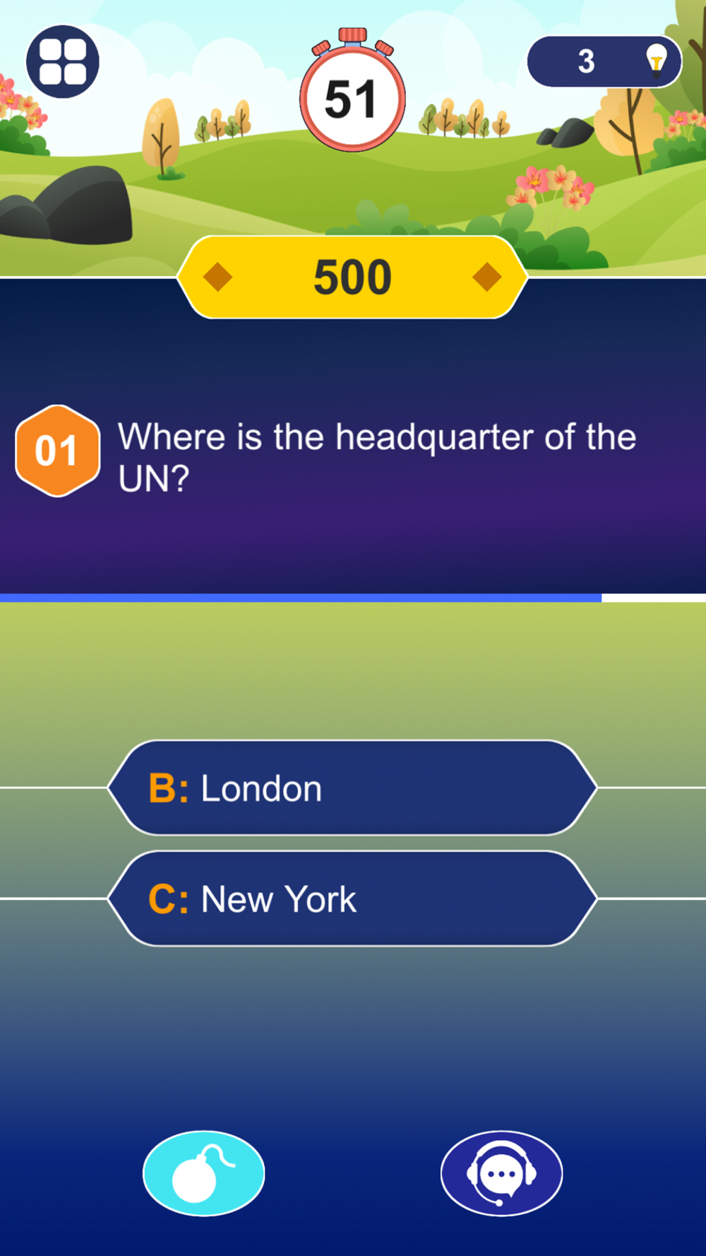 When you choose the wrong answer, you will have one chance to save yourself from losing and keep playing the game by watching short ads or using a hint.