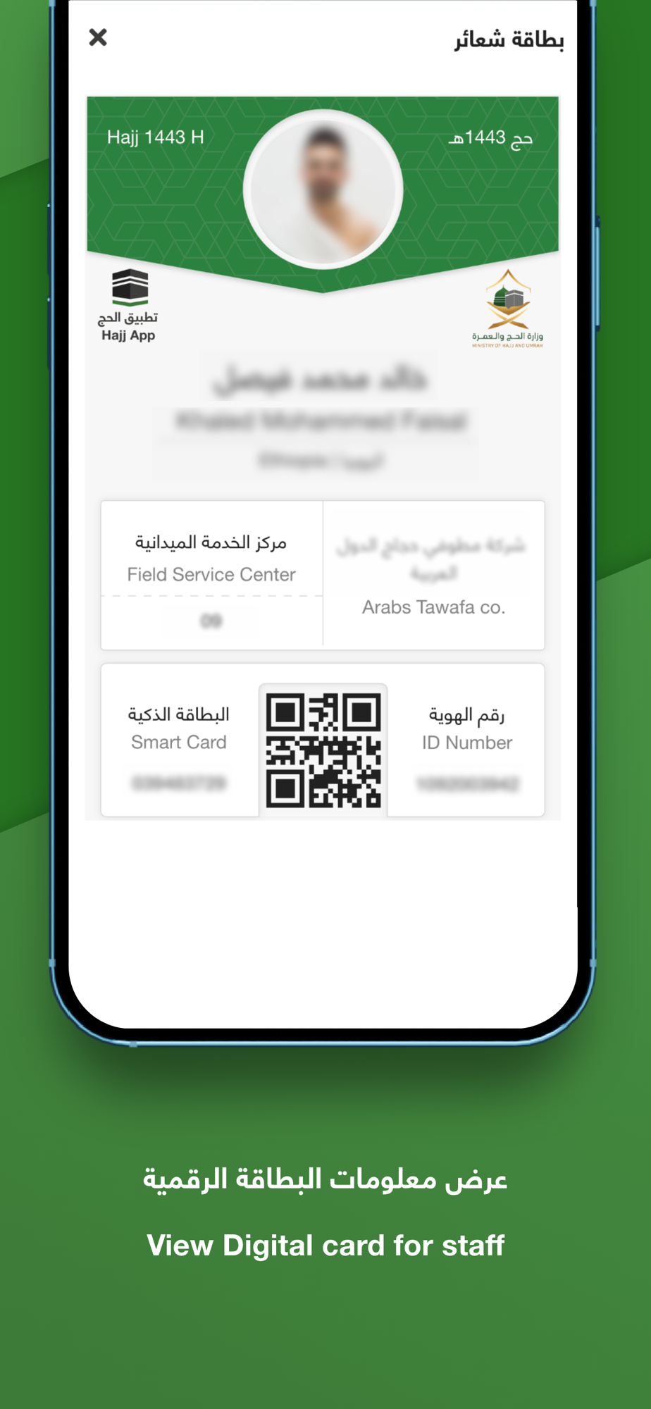 This application provide Hajj pilgrims with access to various digital services enabled through the Hajj Smart Card Platform such as digital card with QR code , View demographic details , Hajj package information, chat with group leader, navigation to point of interests, receive notifications, submit satisfaction survey , raise complaints and general guidance of Hajj ritual.