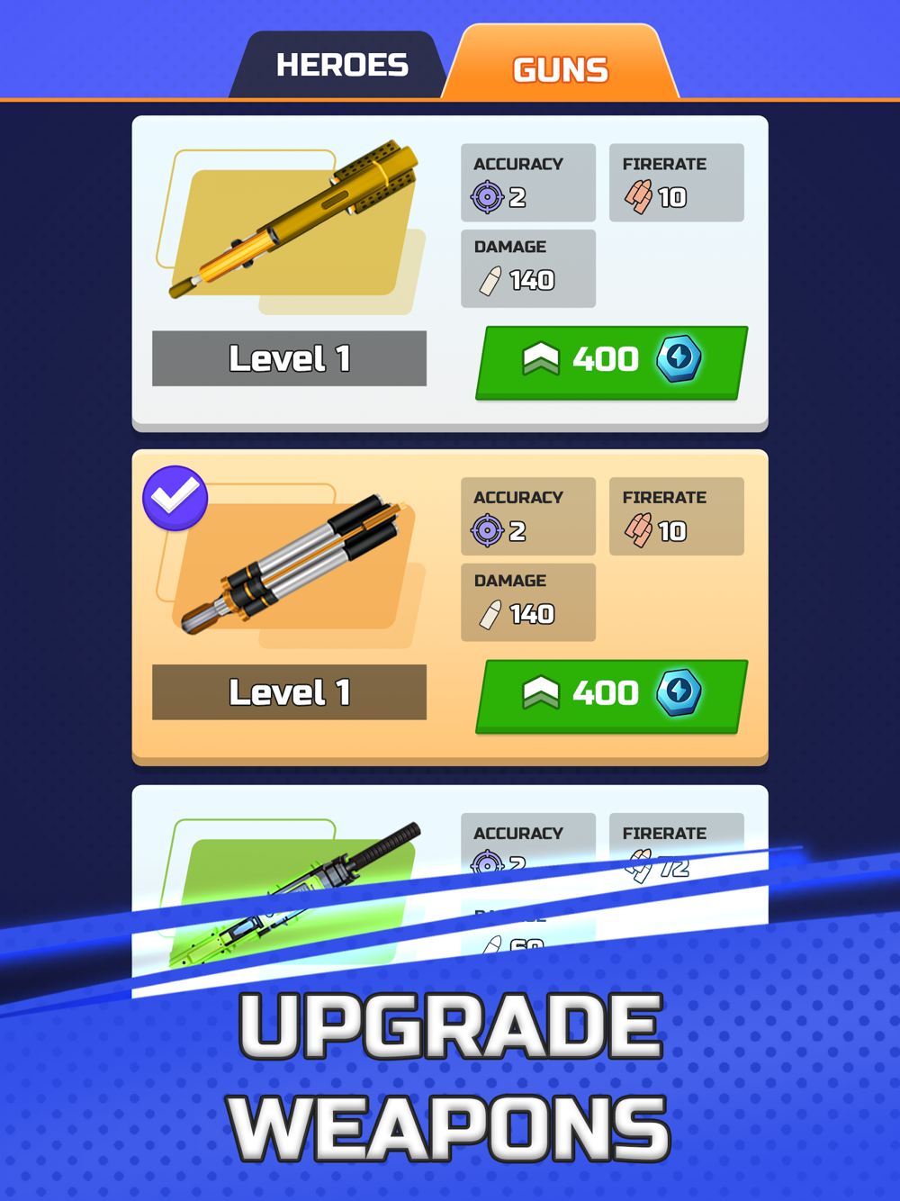 Each eliminated target drops valuable gems. Use them to unlock and upgrade new heroes and weapons.