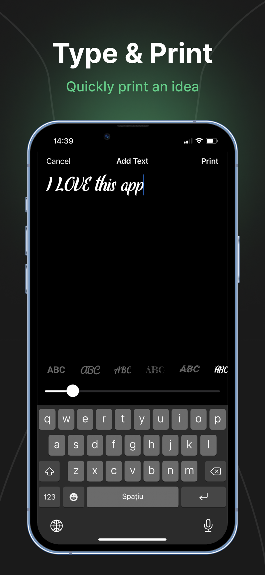 · Print text - Type & Print Text is an easy way to write your ideas and print them immediately at the same time, just select the font and size.
