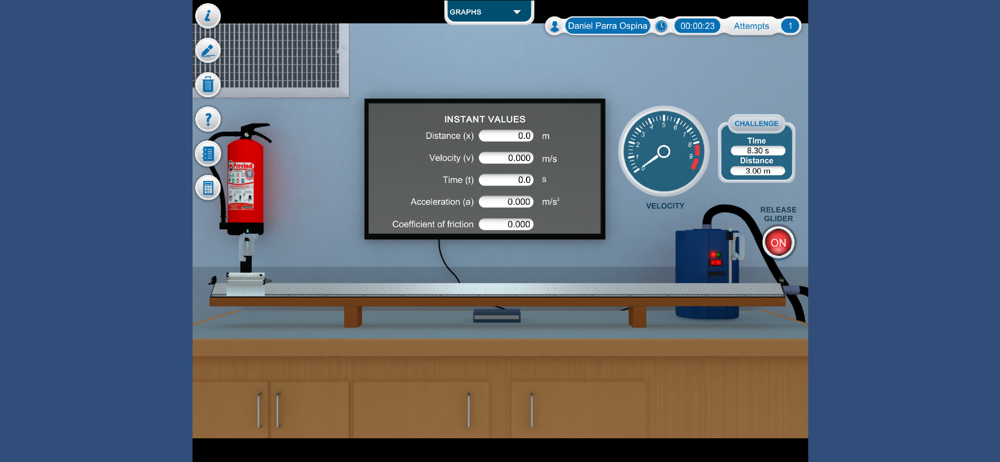In this simulator it is possible to study uniform rectilinear motion. For the development of this practice, the student has an air rail with a mobile, an air pump to eliminate friction, sensors to detect movement and a screen that shows the instantaneous measurements of the movement. It is necessary to configure the air rail to be able to travel a certain distance in a certain time.