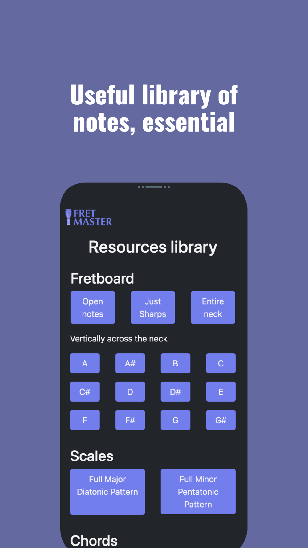 The app also tests your chord knowledge, knowledge of the Major and Minor Diatonic and Pentatonic scales, and Root notes for soloing - use the app however you wish to achieve your guitar journey goals!