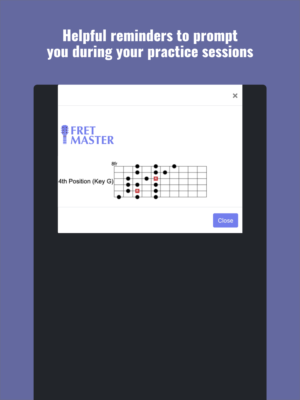 Fret Master challenges you, with your guitar to memorise the notes and if you really can't find the note - the app offers a gentle reminder. You'll find as you use the app that your memory of the location of the notes will really improve and your knowledge of the fretboard.
