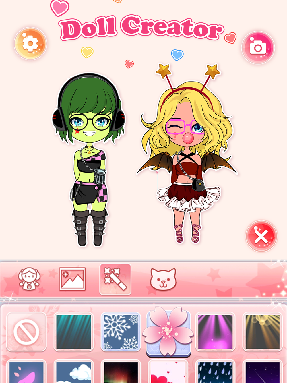In the Chibi Doll town, you can both designer your dolls, change the scenery, the motion effects and add cute pet stickers. Unleash your imagination, to create a town with cute Chibi characters and doll maker friends. Let's explore: