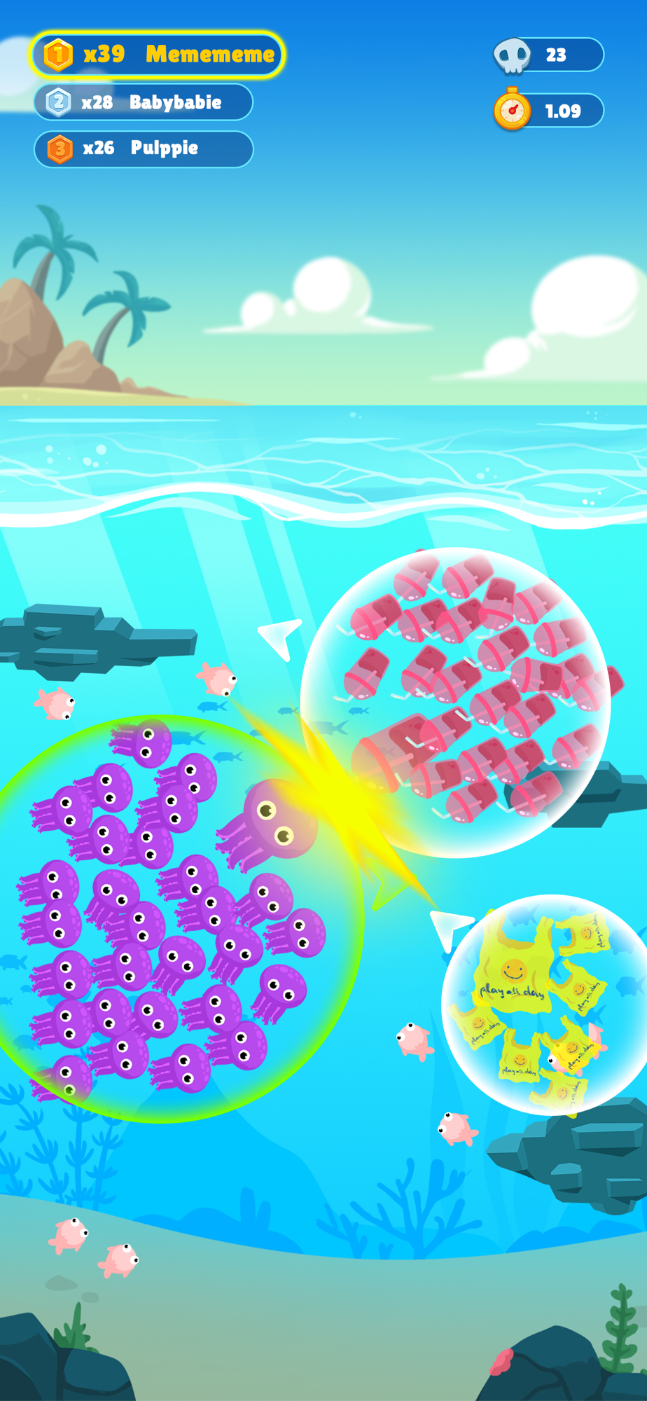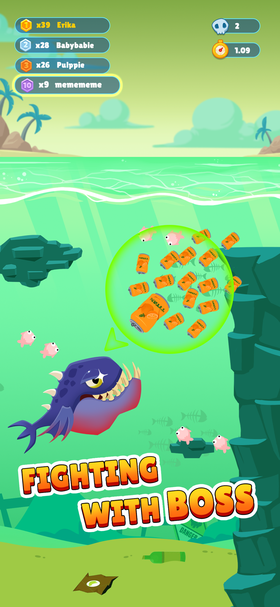 Collect homeless fish, swallow your opponent's team, become the largest school of fish in the world, and save the Atlantis! Use the booster to defeat your enemies rapidly