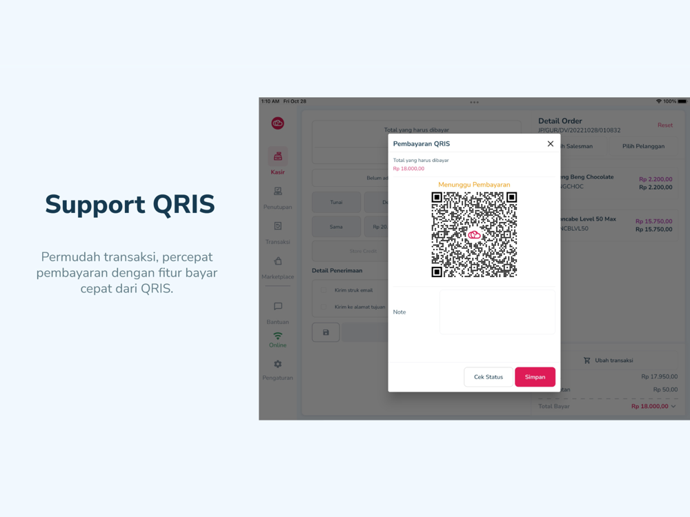 Terima Pembayaran Digital langsung dari Aplikasi Jubelio POS. Berikan Pelanggan Anda kemudahan untuk melakukan Pembayaran QRIS dari Aplikasi Wallet dan Banking yang dimiliki.