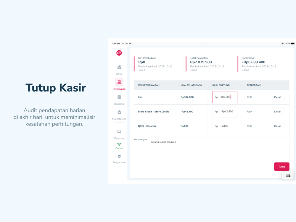- Catat semua tipe pembayaran (tunai, kartu debit/kredit, e-wallet, atau lainnya)
