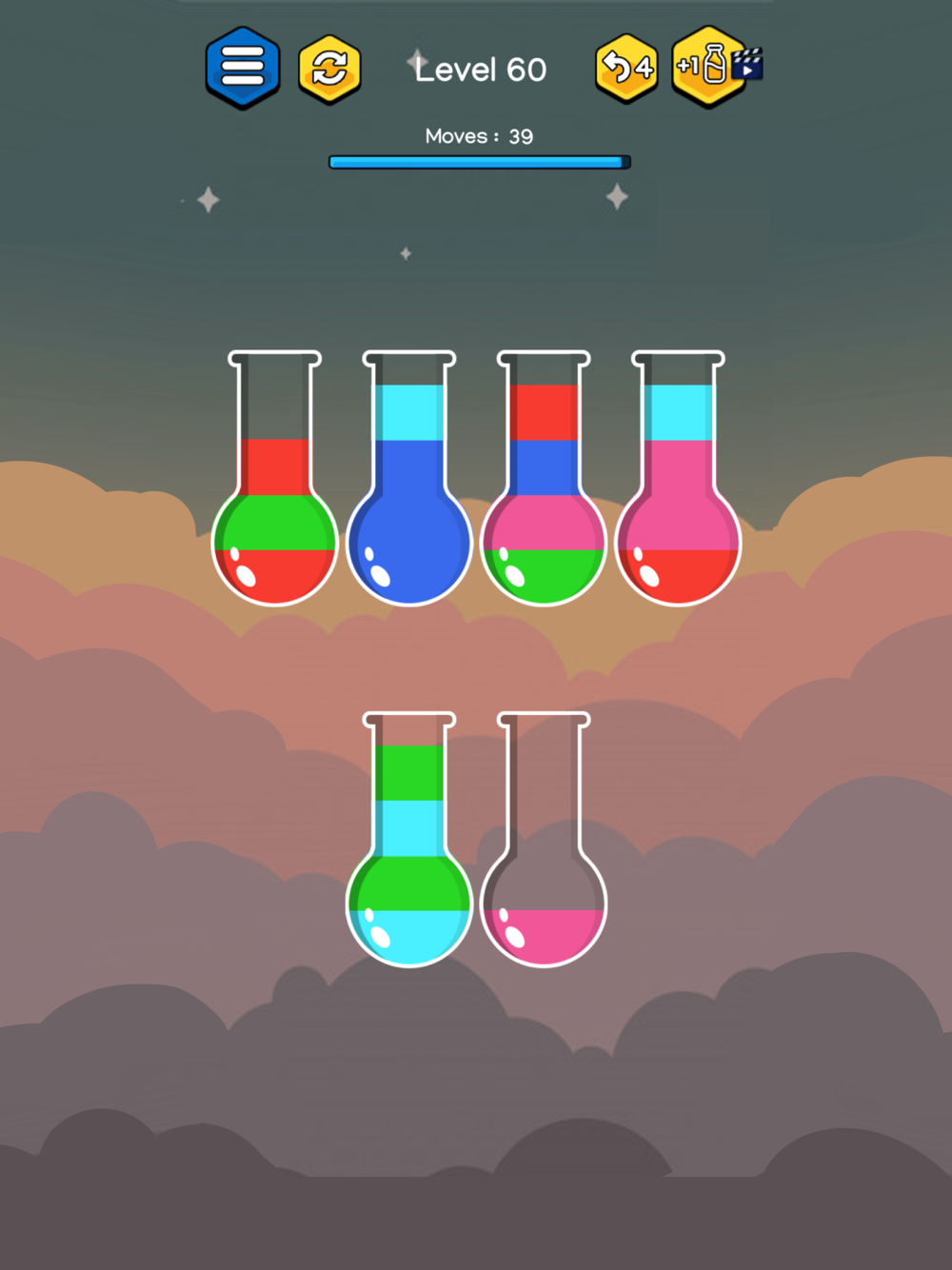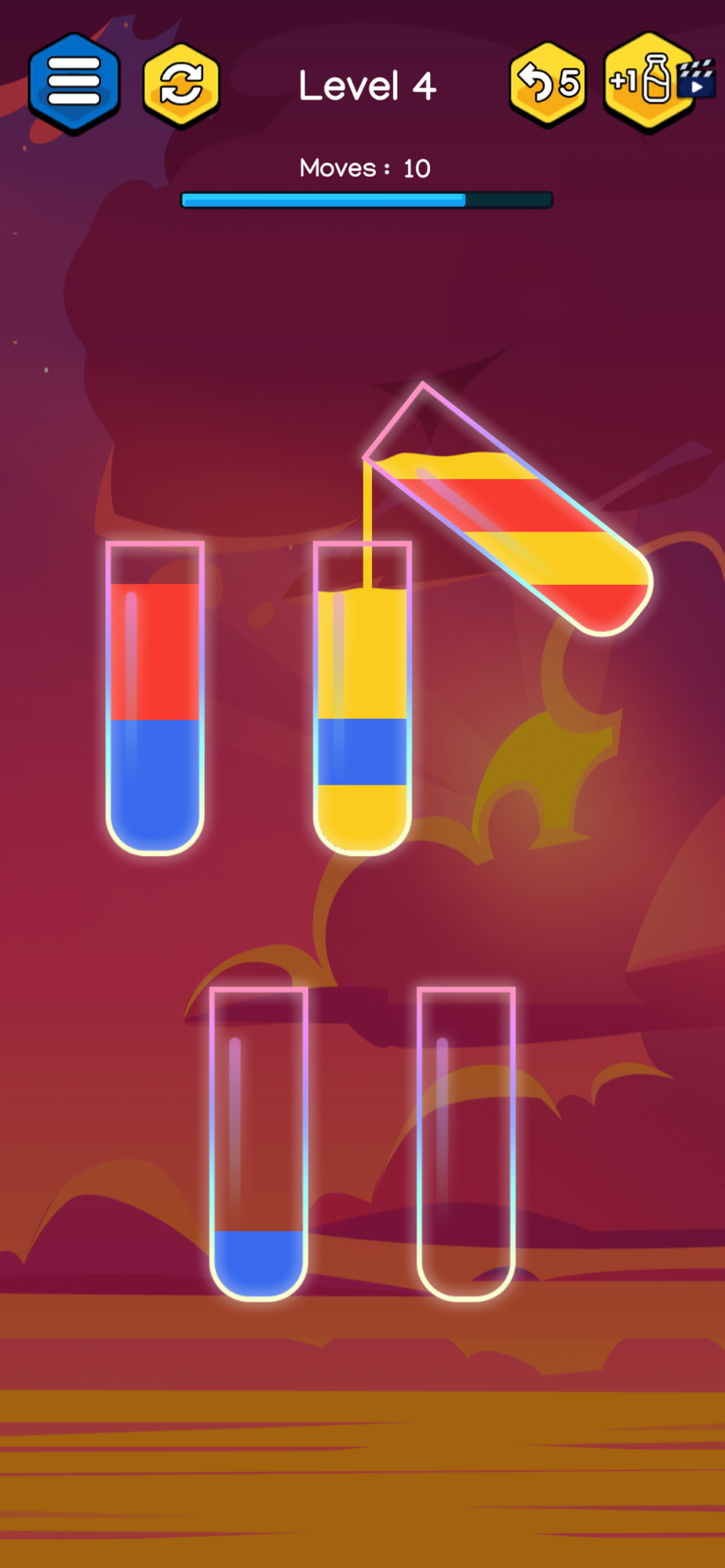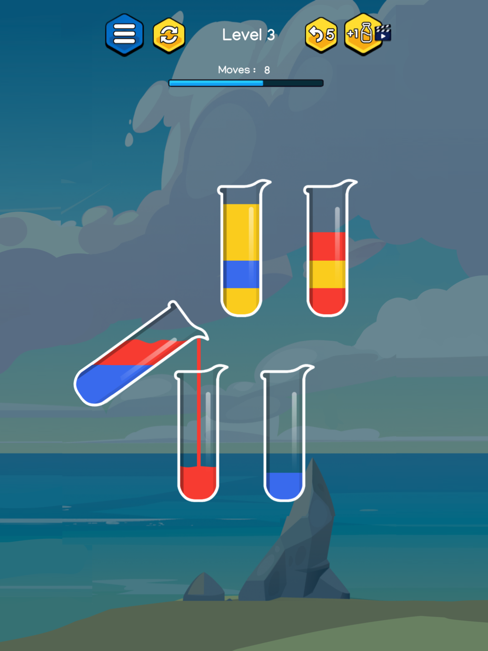 - Sort the colors into the tubes until each has its own color to complete the challenge