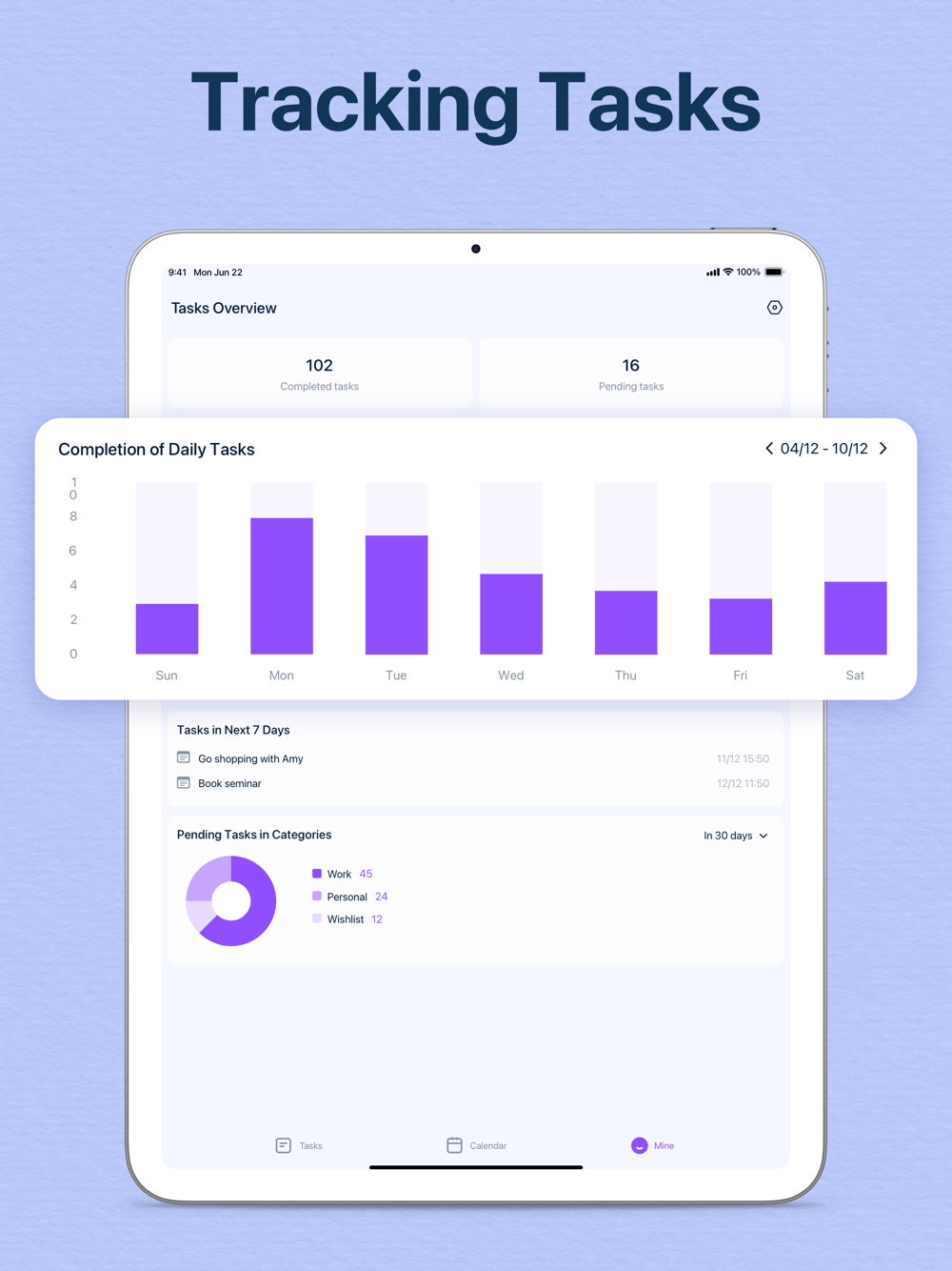 Take some time on this To Do List Task Manager to check the to.do.list completed status of your daily planners on the "MINE" page. You will find that your life gets well organized during the days using this to-do list & task manager.