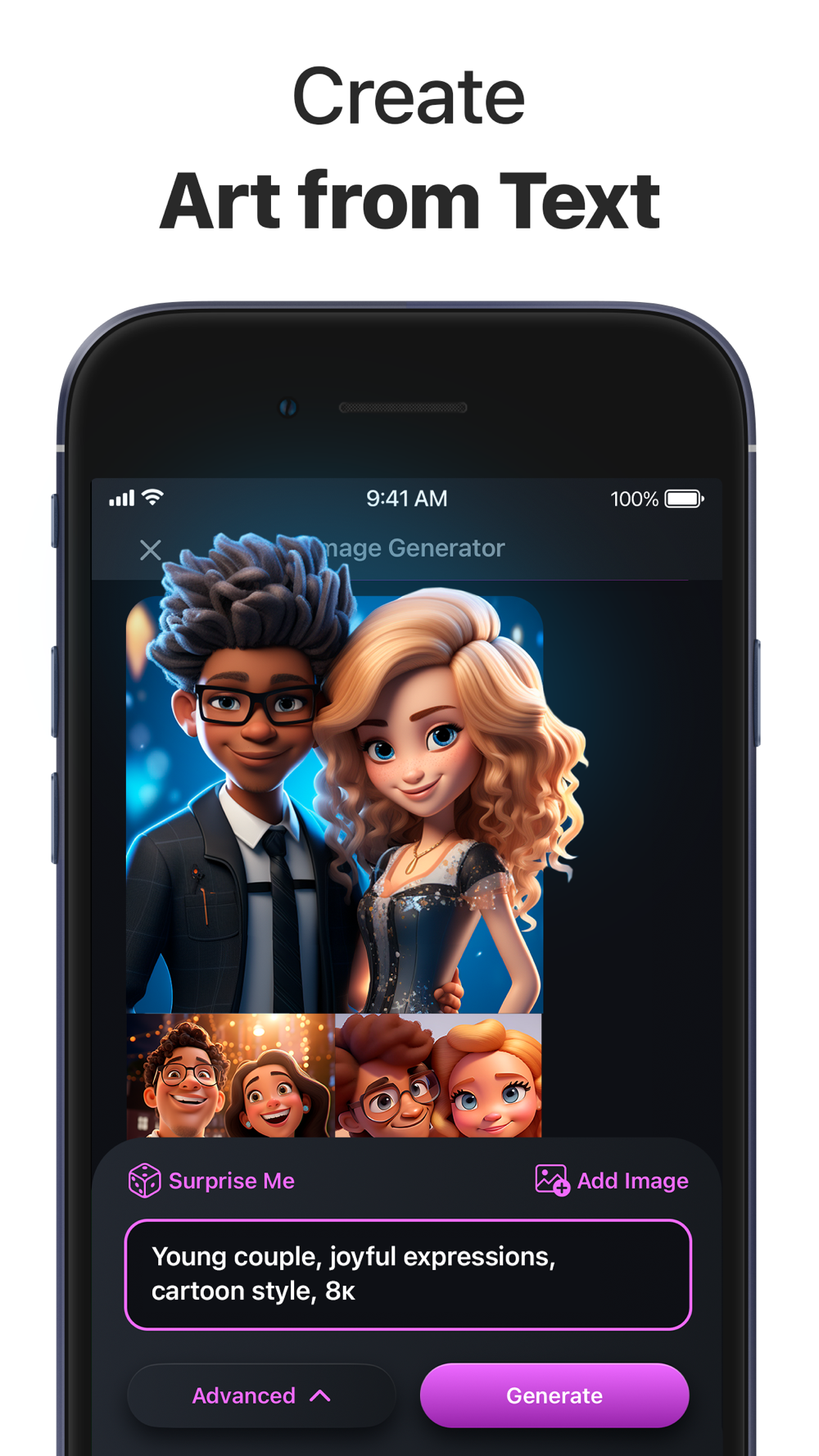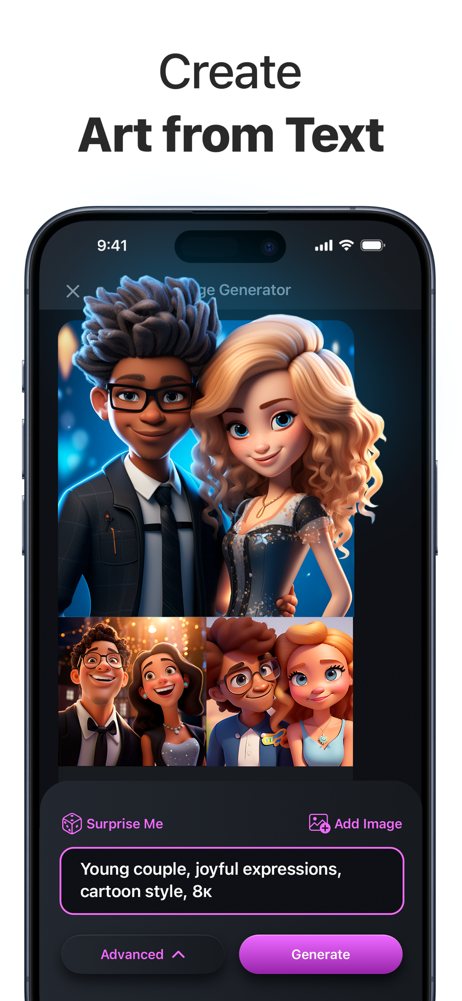 AI Arta has mastered a variety of art styles and techniques: from cartoonish pencil sketches to mind-blowing photorealism. Experiment with styles and see which one captures your idea best.