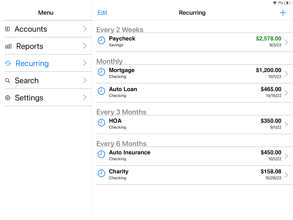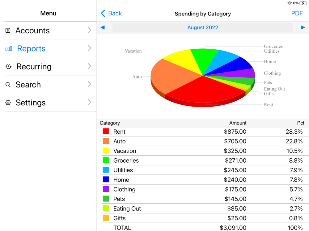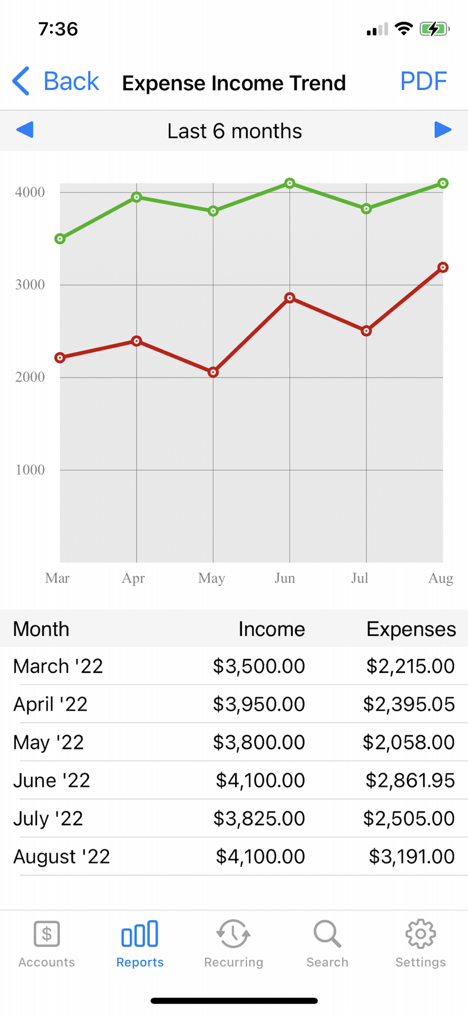 Review your monthly income vs. expense, spending by category, or income by category summaries with beautiful graphs and reports.