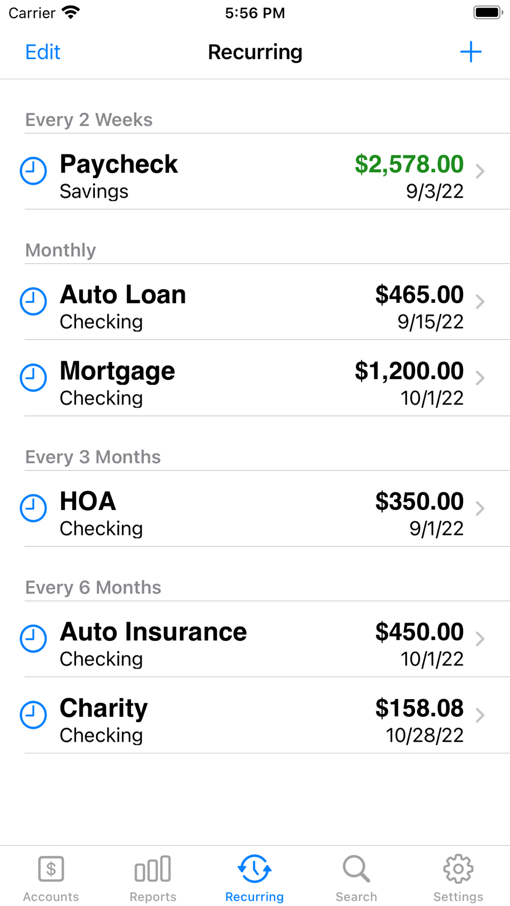 Schedule transactions to repeat weekly, biweekly, monthly, semimonthly, quarterly, biannually, or yearly on a start date that you choose.