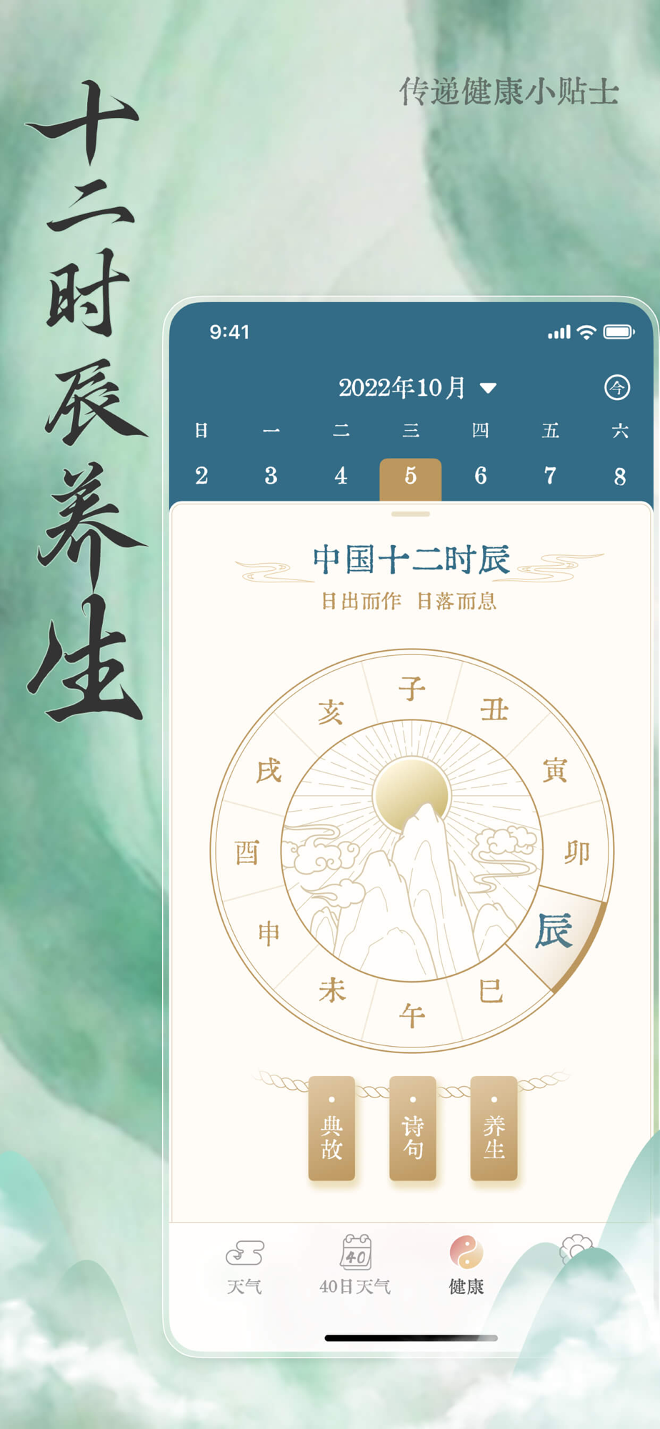 这是中国天气与中国养生的结合,我们为您准备了养生时钟,每个时辰都有健康小贴士。快来体验,一起拥有安心的身体状态!