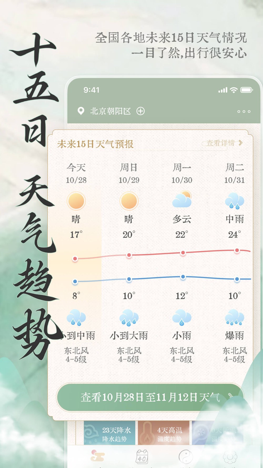 我们提供分钟级别的实时精准天气预报,出门看安心天气就会很心安;诗画与天气的结合以及独有的中国风精美天气组件。
