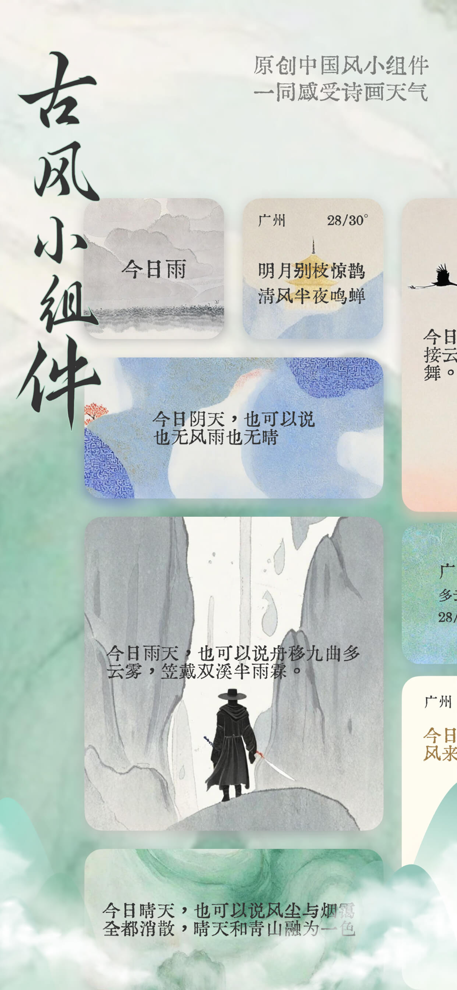 原创中国风天气组件,手机桌面随时随地查看诗画天气。一起感受古代诗人如何用诗句浪漫地表达不同的天气。