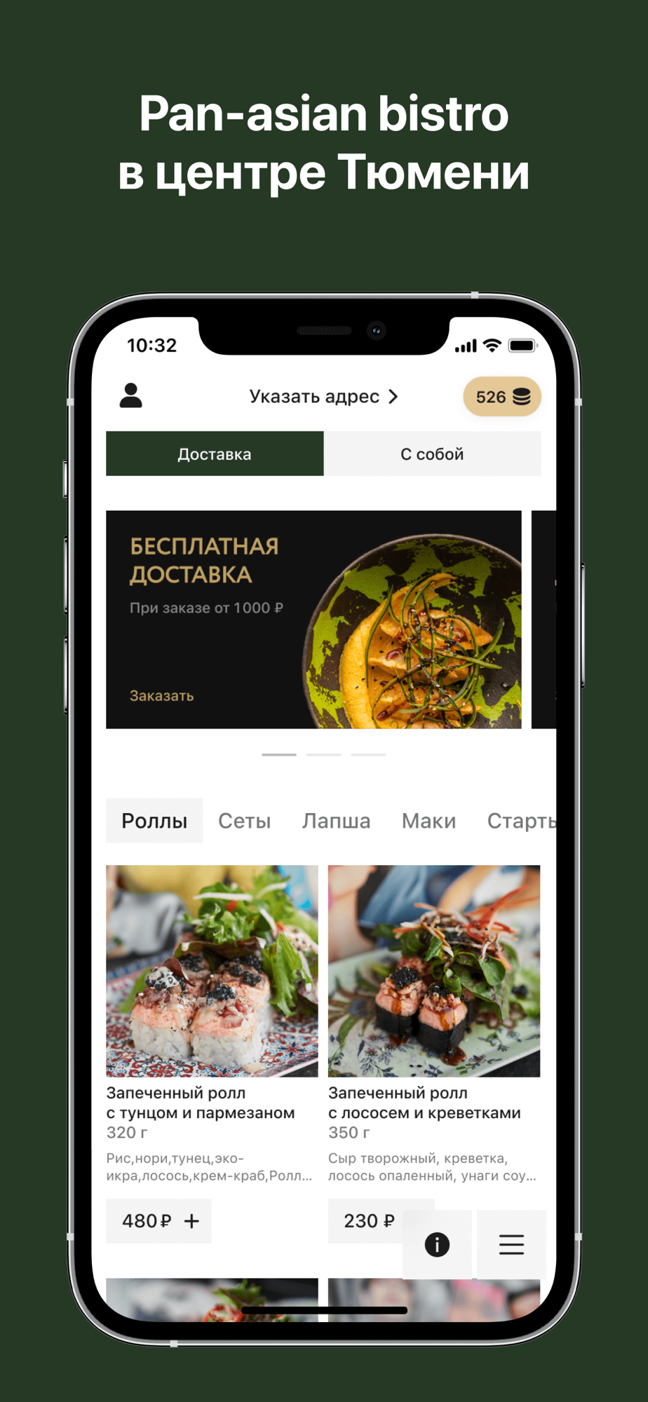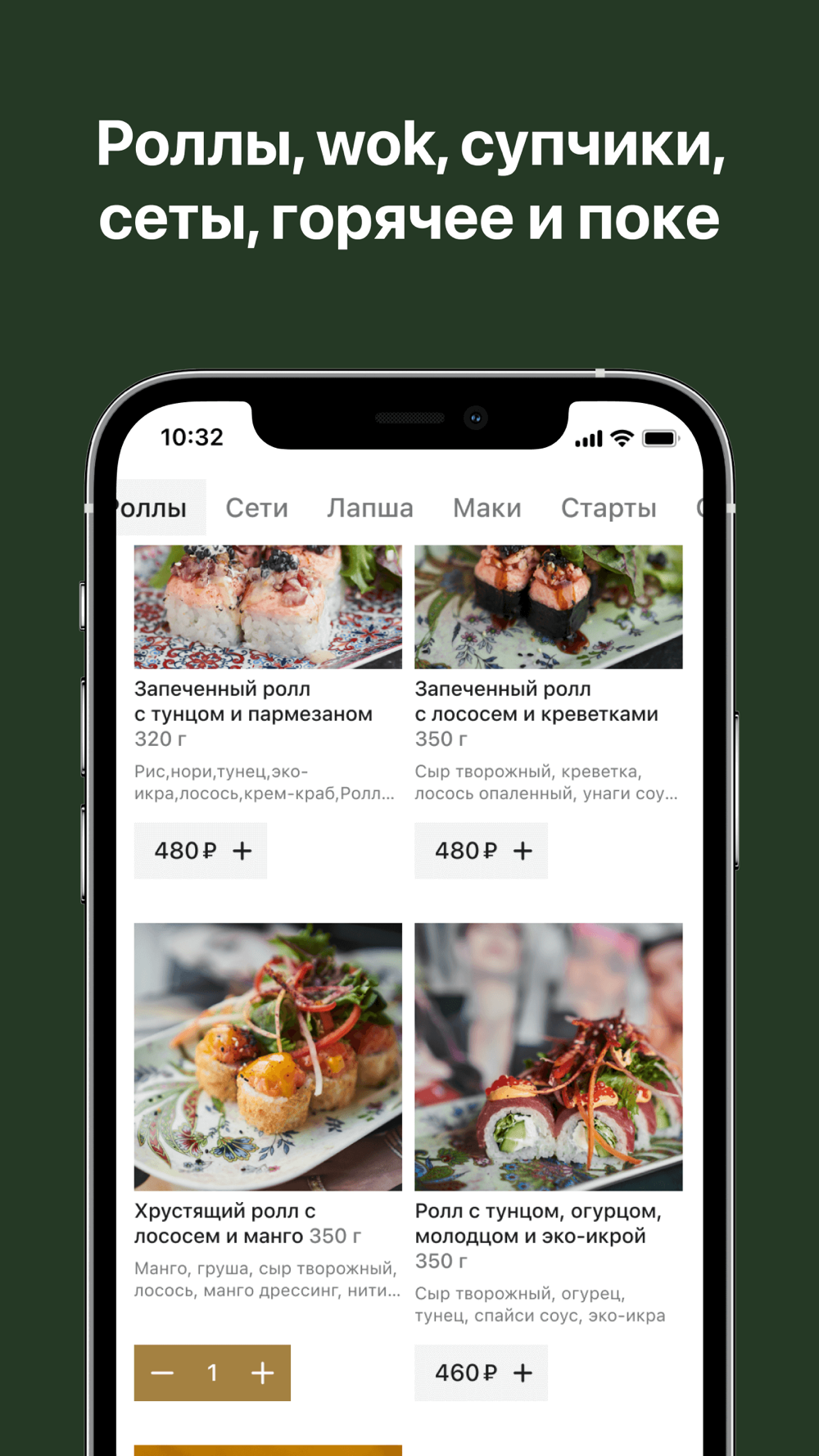 Здесь: роллы, wok, супчики, сеты, горячее и поке.