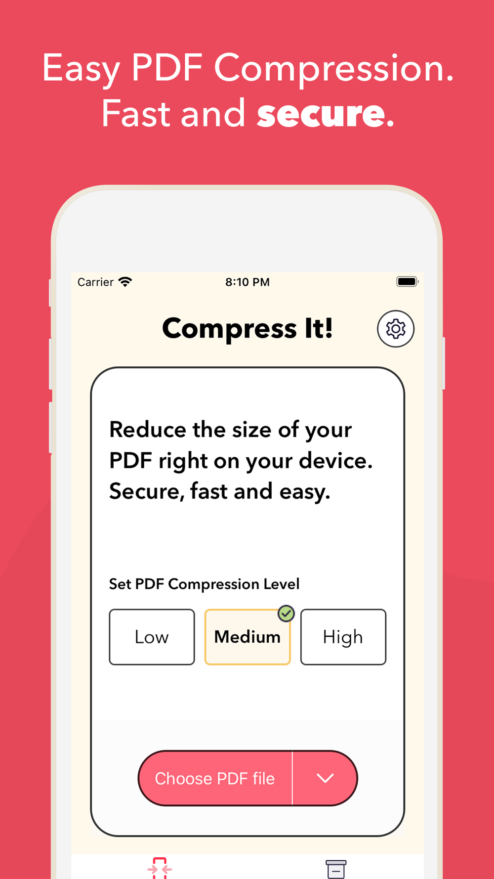Every PDF compression is done right on your device. That means all PDF files are securely stored on your device and the compression is done in seconds (As it should be!)