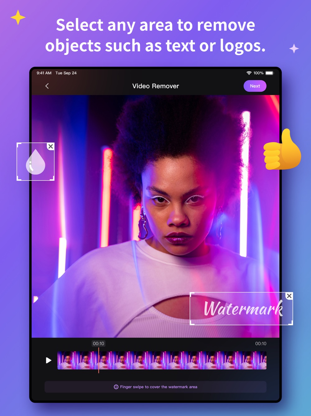 Remove unwanted objects, people, text, logo, and watermark with one stroke.
