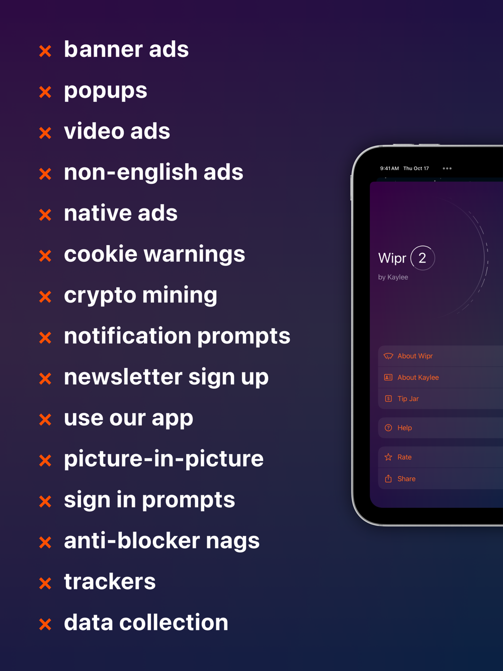 Wipr blocks ads, popups, trackers, cookie warnings, and other nasty things that make the web slow and ugly.