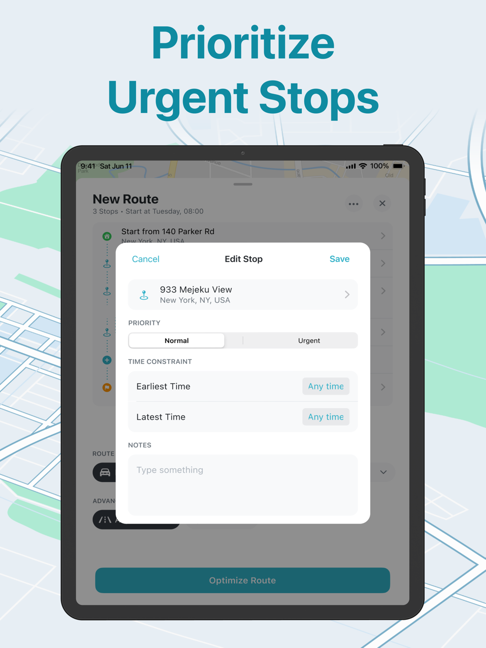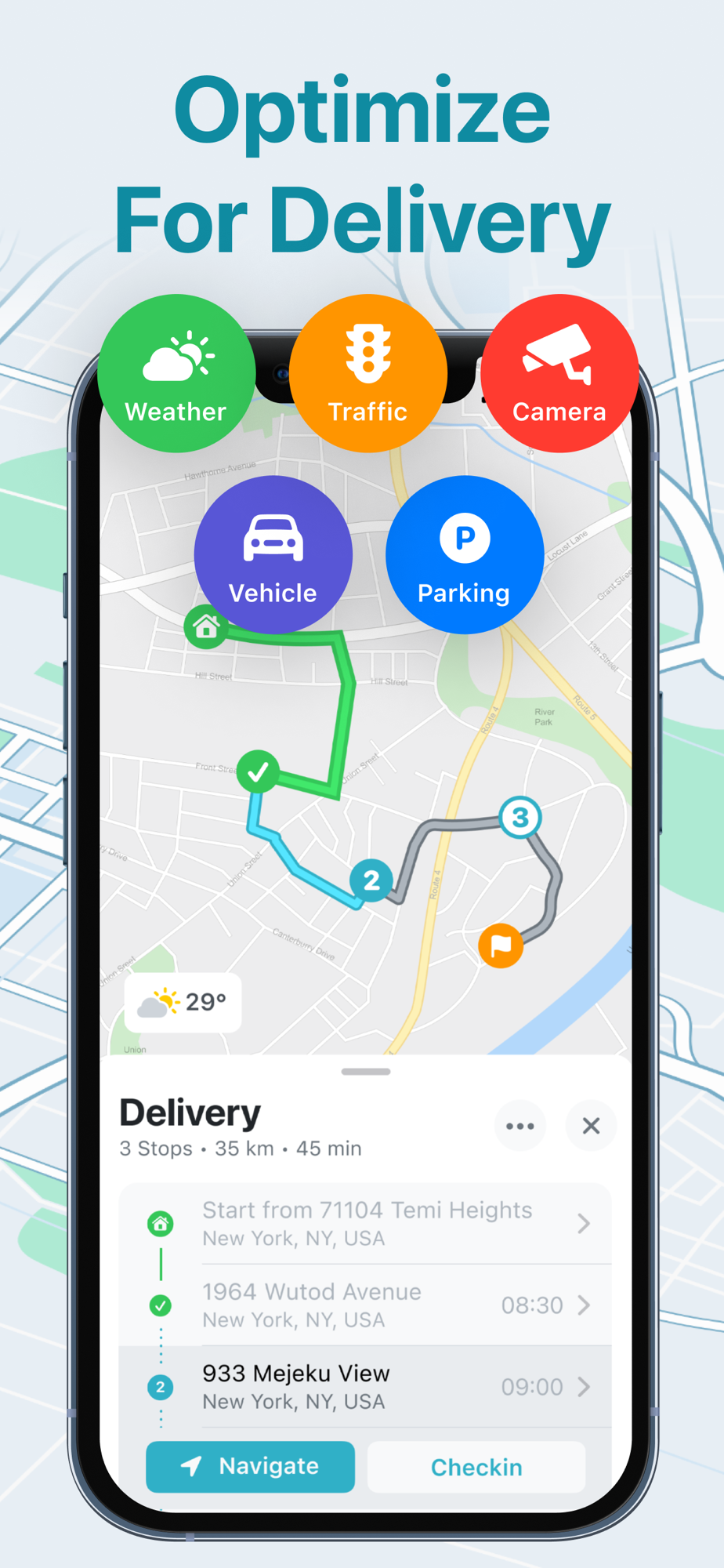 > Optimize routes for weather, traffic, police camera, vehicle type, parking space, priority