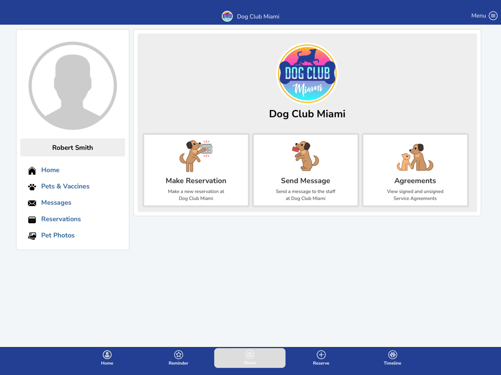 The Dog Club Miami App enables users to make reservations, purchase package credits, see and pay invoices, message with Dog Club Miami, see photos of their pets, and more. Employees of Dog Club Miami are able to manage the business and connect with customers. This app is made specifically for the customers and employees of Dog Club Miami.