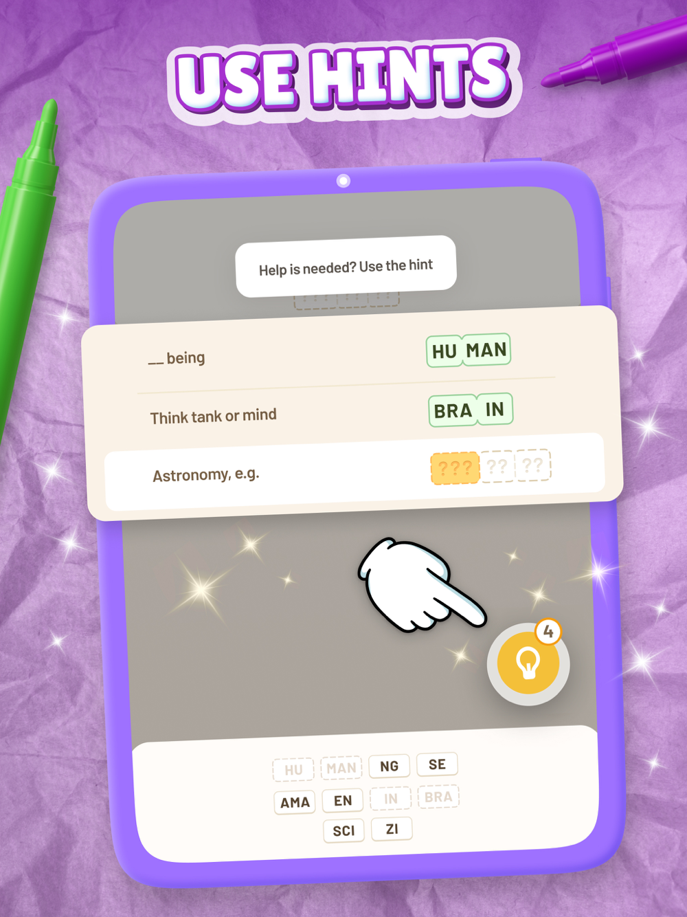 Our word puzzles work perfectly for learning how to follow clues and decrypt lots of mind-dazzling word cryptograms. Never tried it before? Not a problem! The game has both easy and more challenging levels for you to get the most out of your gaming experience. This game is perfect for anyone regardless of age.