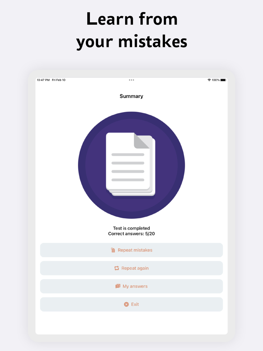 - "Mistake Review" mode to analyze errors in detail and strengthen weak points.