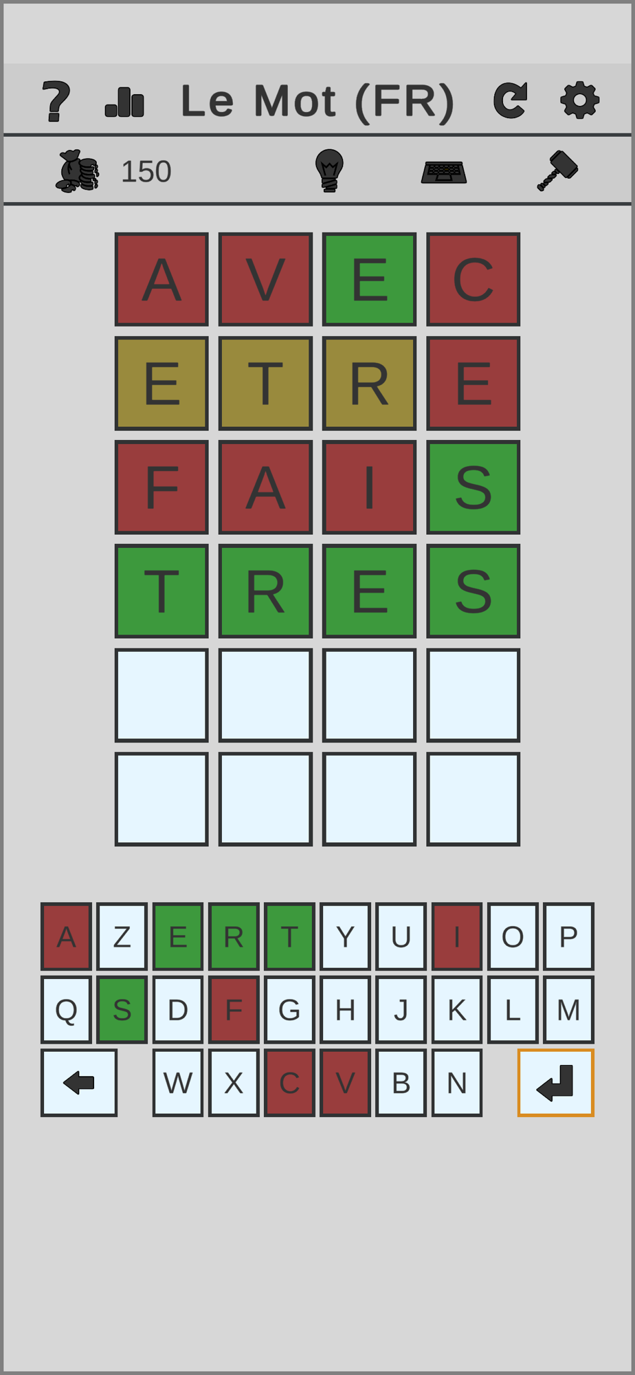 Avec 6 tentatives disponibles, essaie de deviner le mot. Chaque fois que vous devinez une lettre correctement, la tuile correspondante changera de couleur: elle deviendra jaune si la lettre est présente dans le mot ou verte si elle est à la bonne place.