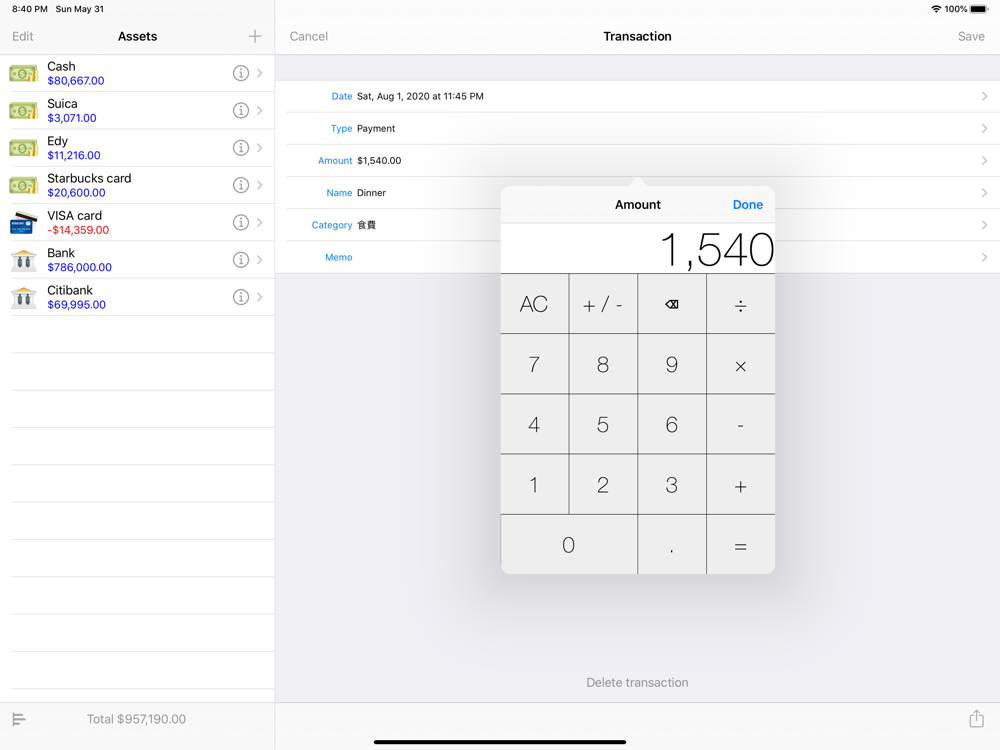You can easily input your daily transactions. You can choose description of transaction from history, much less keyboard operations. Also you can fix balance with simple operation.