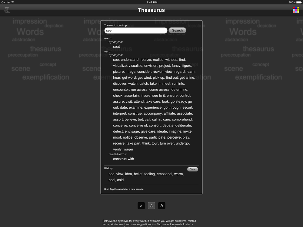Retrieve the synonym for every word. If available you will get antonyms, related terms, similar word and user suggestions too. Tap one of the results to start a quick new search for that term. It keeps a history list of your search terms as well.