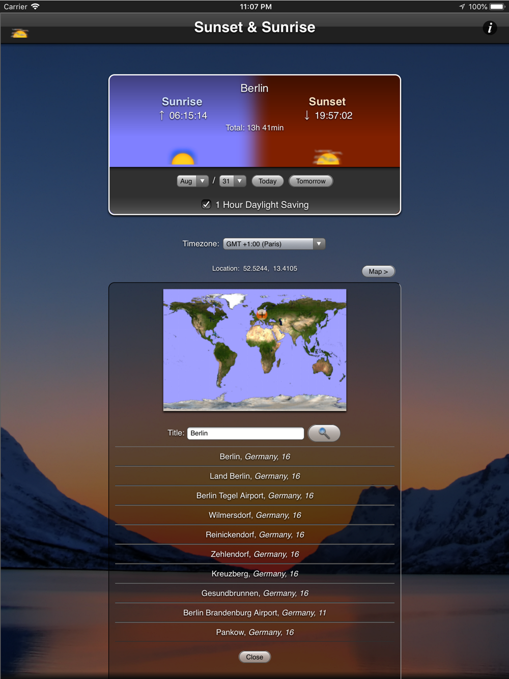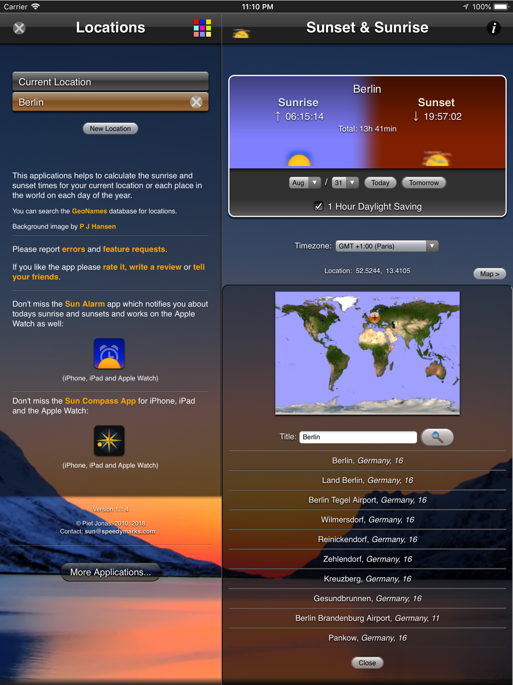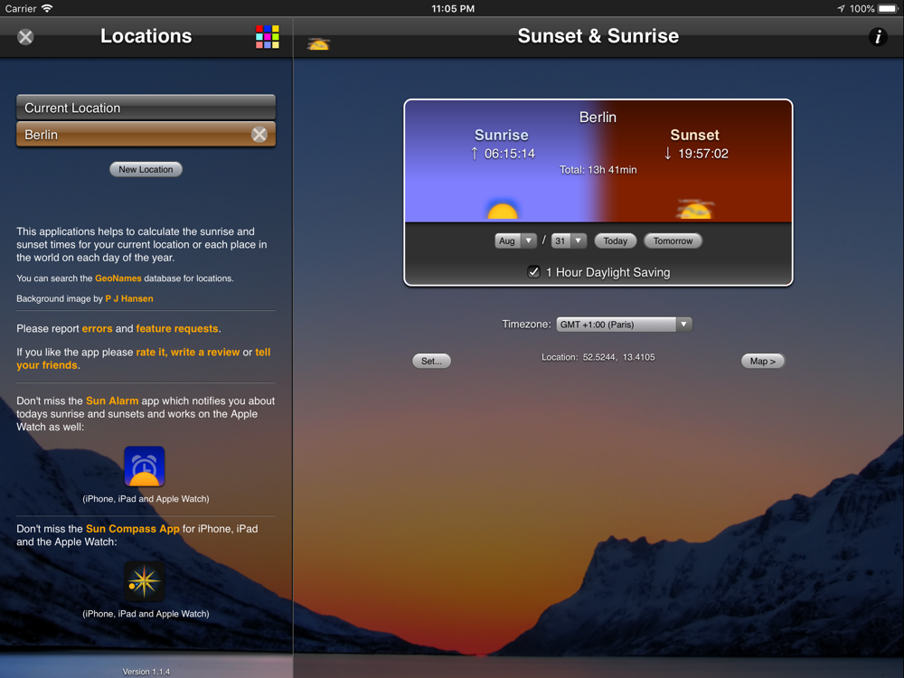 This applications helps to calculate the sunrise and sunset times of your current location or each location in the world on each day of the year. Enjoy planning your next holiday, trip or photo session where ever and when ever you want to go.
